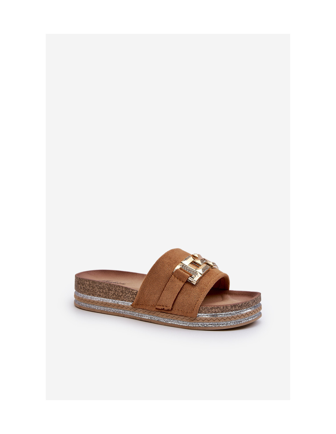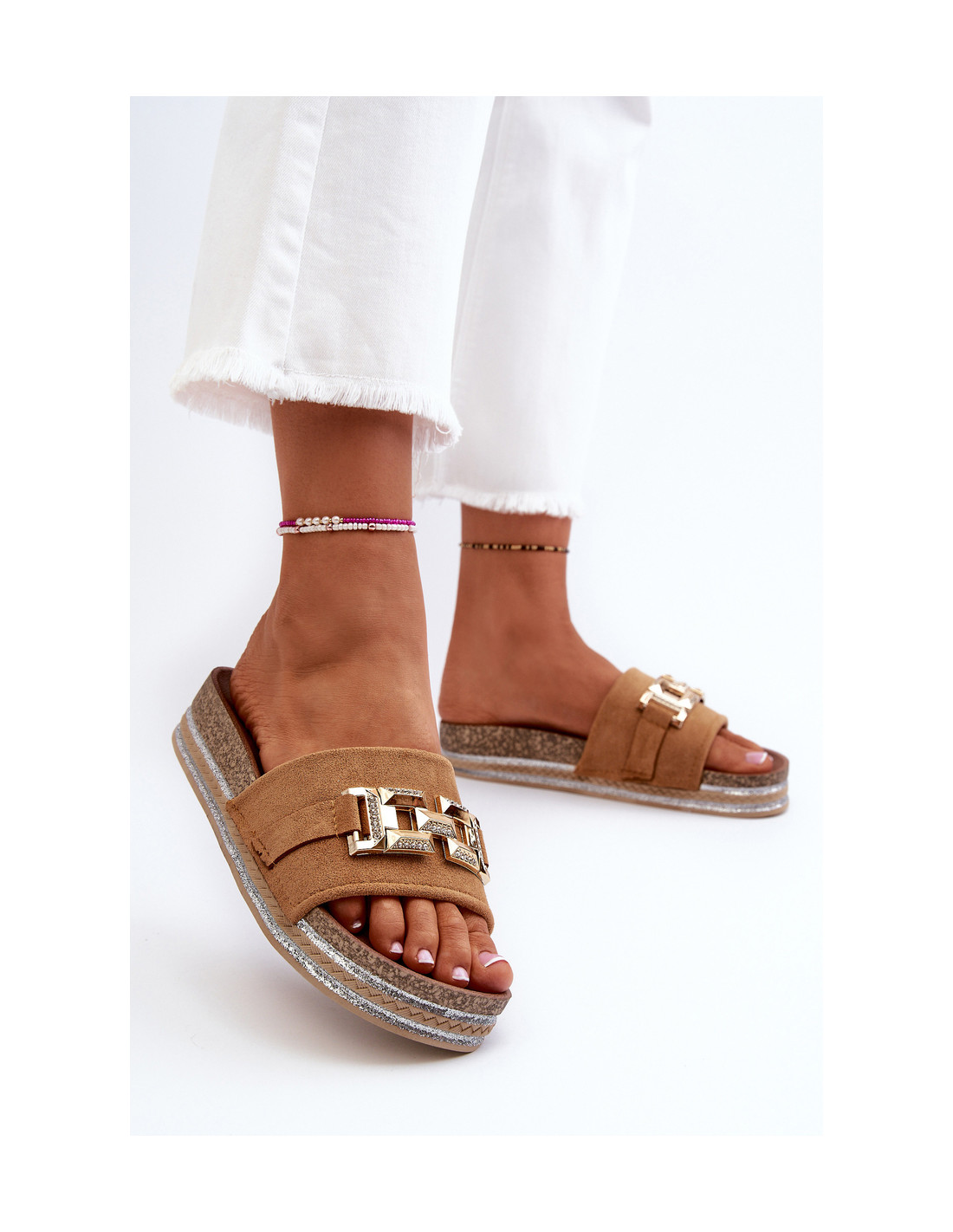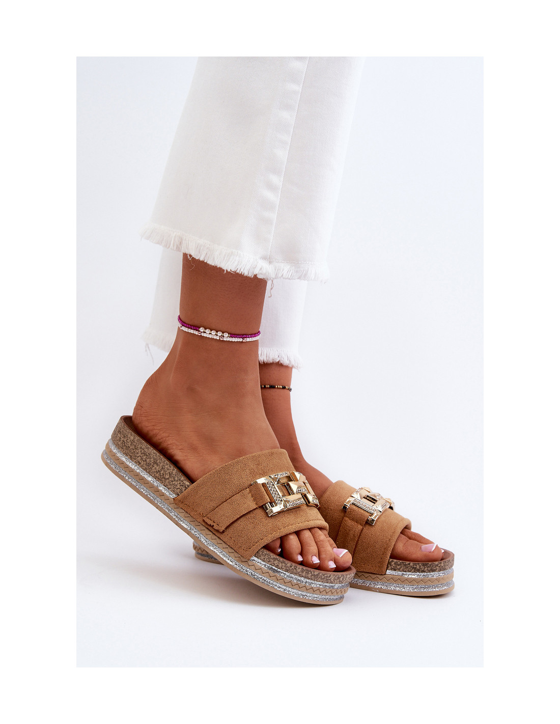 Moteriškos platforminės šlepetės su pynėmis ir blizgučiais, kurios suteikia joms subtilaus švytėjimo ir elegancijos, todėl puikiai papildo vasaros stilius. Auksinis papuošimas priekyje. Šios šlepetės puikiai tiks vasaros susitikimams, paplūdimio vakarėliams ar vakariniams pasivaikščiojimams. Derinkite juos prie vasarinės suknelės ar sijono, kad sukurtumėte madingą ir unikalų stilių. Renkantis dydį, vadovaukitės dydžių lentele.