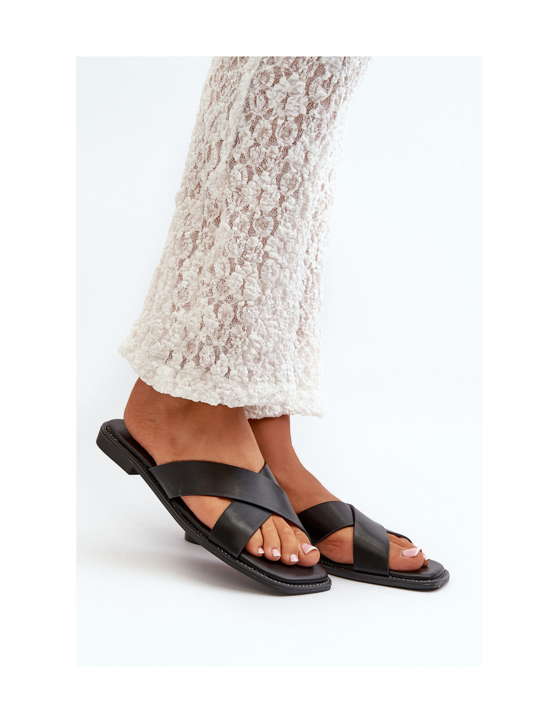 Moteriškos šlepetės iš eko odos. Nustatykite ant plokščio kulno. Dvi persipynusios juostelės suteikia joms stilingą išvaizdą, o krištoliniais akmenimis dekoruotas padas suteikia subtilaus blizgesio. Šios šlepetės puikiai tiks vasaros dienoms, puikiai derančios prie įvairių stilių tiek kasdieniam dėvėjimui, tiek ypatingesnėms progoms. Renkantis dydį, vadovaukitės dydžių lentele.