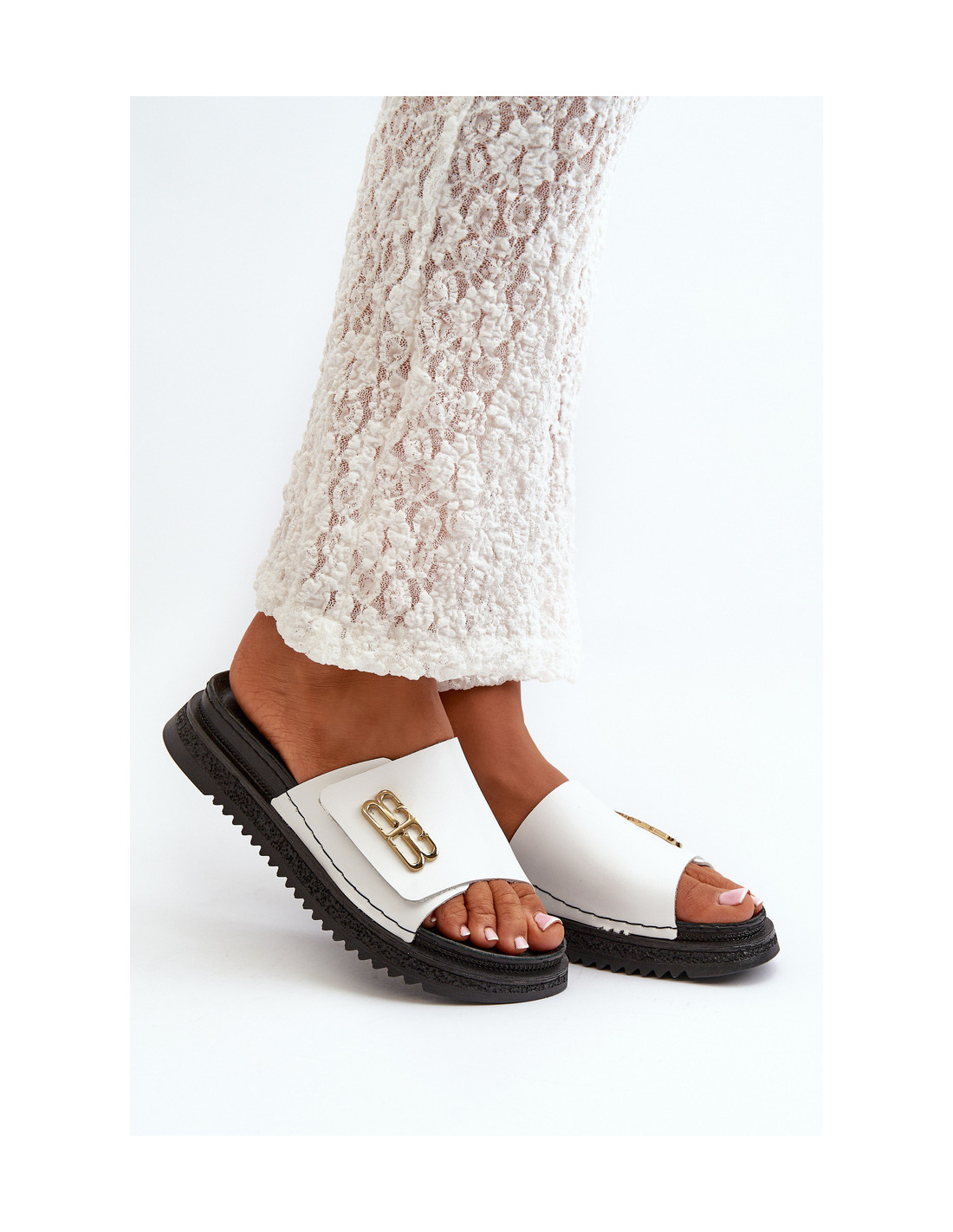 Moteriškos šlepetės iš natūralios odos. Montuojamas ant platformos. Auksine detale puoštas diržas prideda elegancijos. Puikiai tinkantys vasaros dienoms, šios šlepetės puikiai papildys bet kokį stilių, derindamos funkcionalumą su madinga išvaizda. Renkantis dydį, vadovaukitės dydžių lentele.