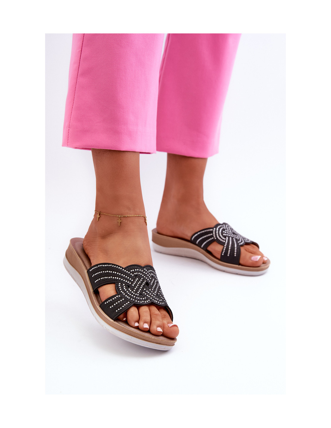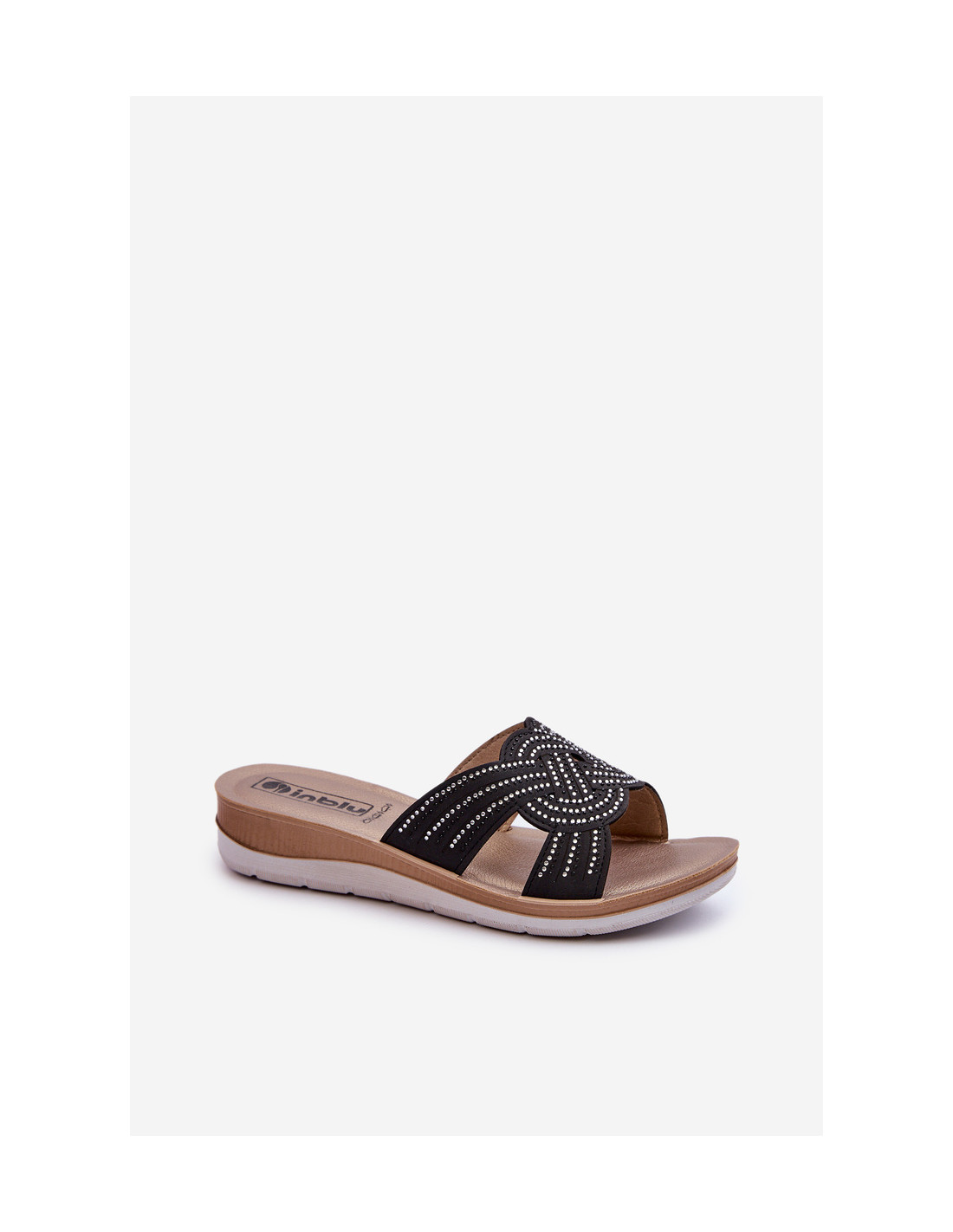 Lengvos moteriškos INBLU šlepetės. Nustatykite ant subtilaus pleišto. Priekis dekoruotas cirkoniais. Minkštas vidpadis užtikrina komfortą naudojant net visą dieną. Itin patogus modelis, puikiai tinkantis karštoms dienoms! Renkantis dydį, vadovaukitės dydžių lentele.