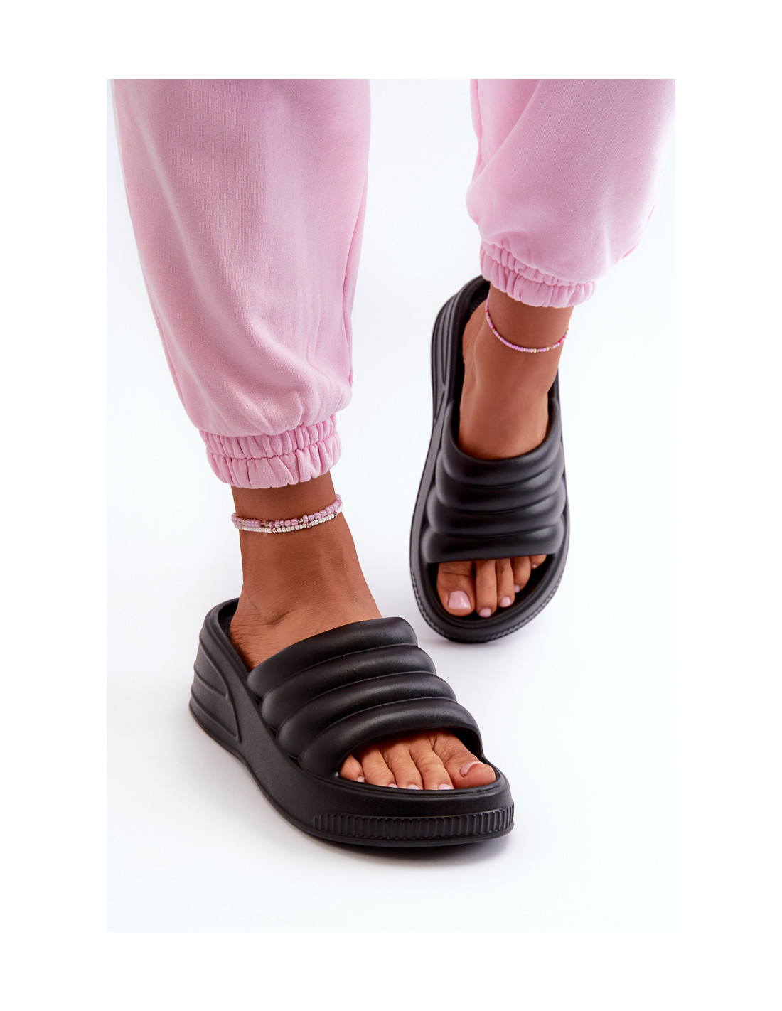 Moteriškos šlepetės iš putplasčio medžiagos. Pastatykite ant platformos ir pleišto. Lengvas modelis, puikiai tinkantis dienoms, praleistoms prie baseino! Renkantis dydį, vadovaukitės dydžių lentele.
