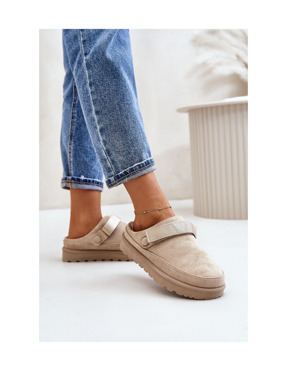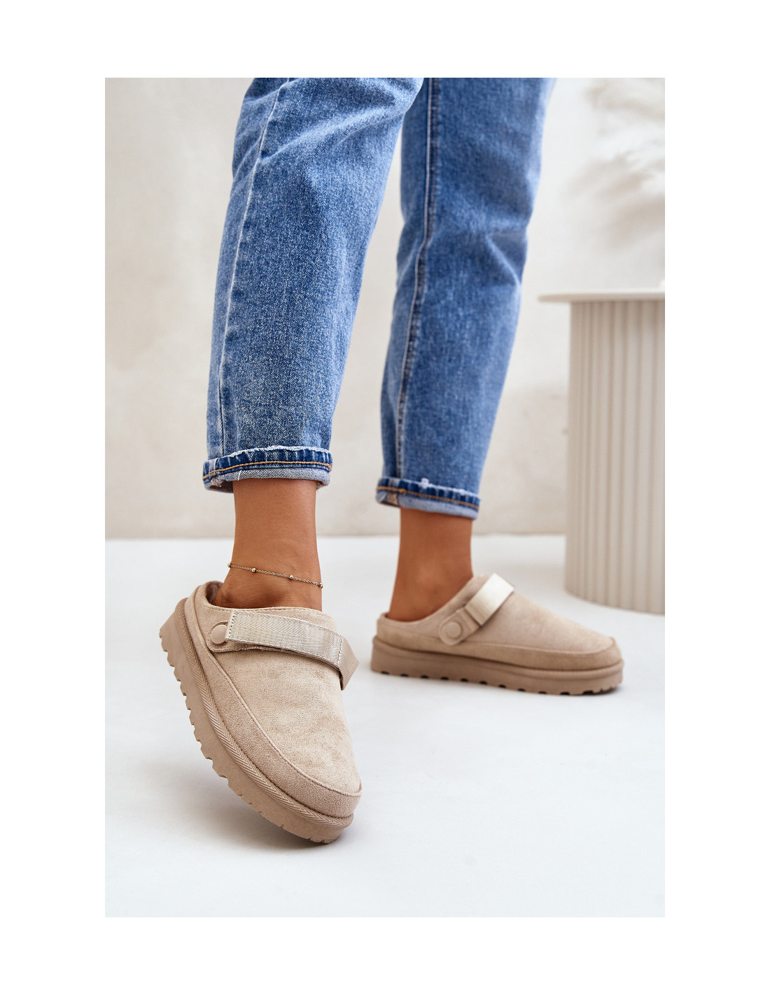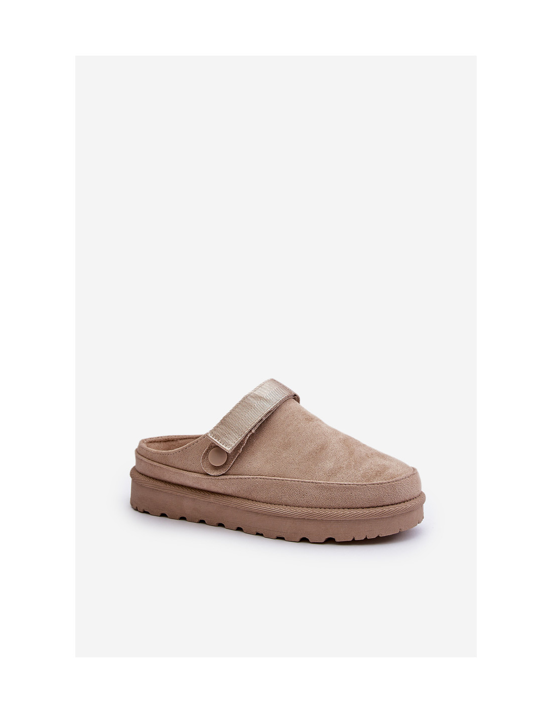Moteriškos šlepetės iš ekologiškos zomšos. Montuojamas ant platformos. Vidus apšiltintas maloniu kailiu, kuris užtikrina komfortą šaltesnėmis dienomis. Be to, jie turi judantį dirželį su Velcro užsegimu, kuris stabilizuoja kulną ir leidžia puikiai priglusti. Puikiai tinka kasdieniam naudojimui, jie derina stilių ir funkcionalumą. Renkantis dydį, vadovaukitės dydžių lentele.