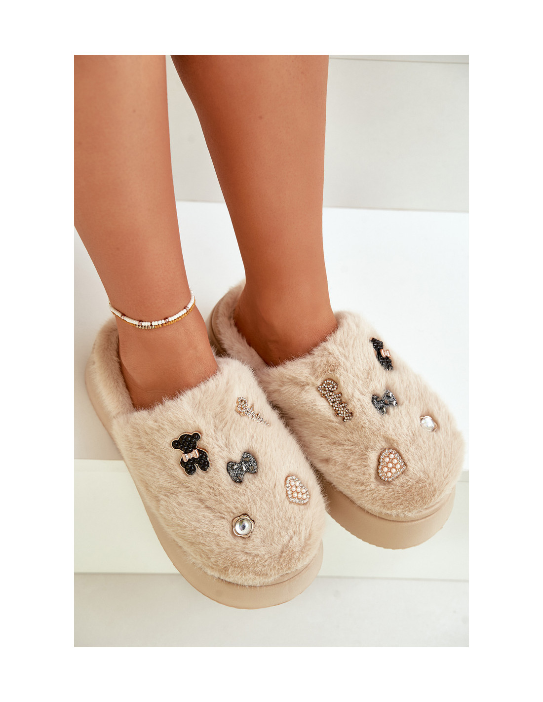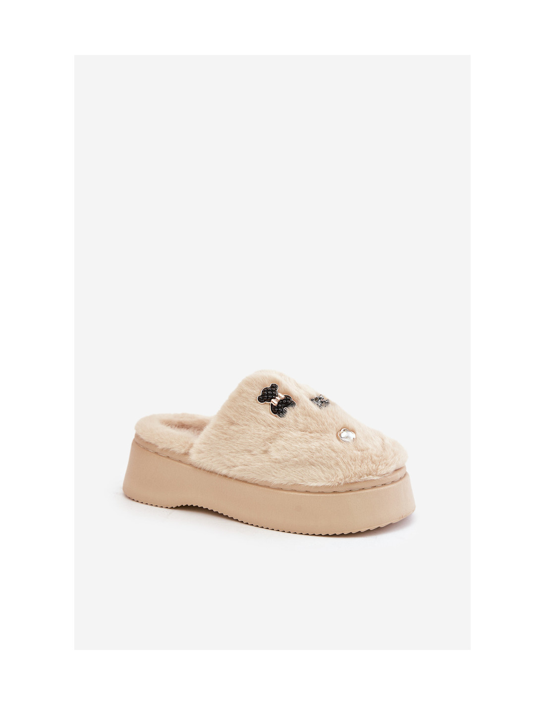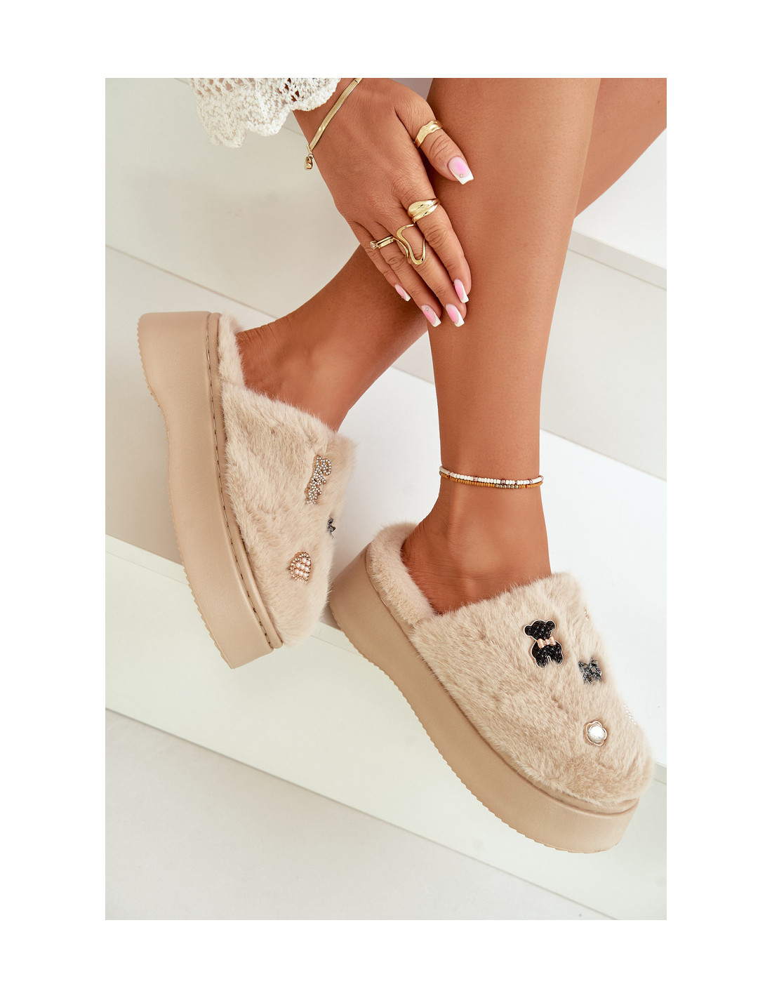 Moteriškos kailinės šlepetės ant storo pado su segtukais, smėlio spalvos Zintoria