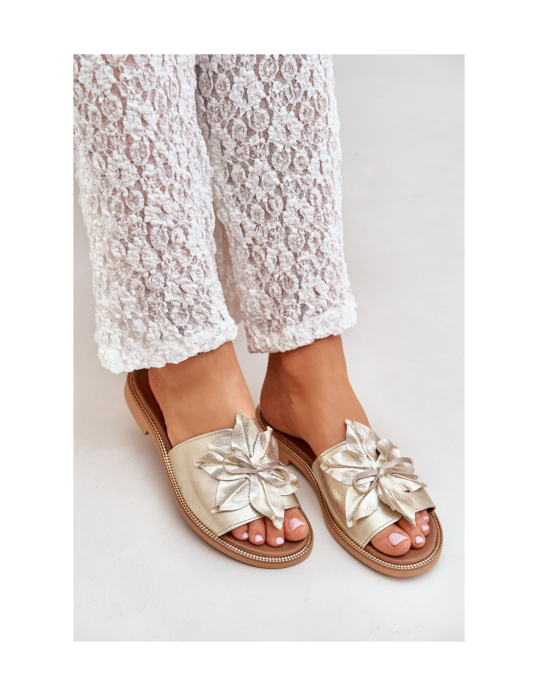 Moteriškos šlepetės iš natūralios odos yra puikus pasirinkimas moterims, ieškančioms elegancijos ir komforto derinio. Plokščias kulnas užtikrina patogumą naudoti visą dieną. Dekoracija suteikia jiems nepakartojamo žavesio ir elegancijos. Šis modelis yra puikus pasirinkimas tiek elegantiškam biuro stiliui, tiek kasdienėms išvykoms! Renkantis dydį, vadovaukitės dydžių lentele.
