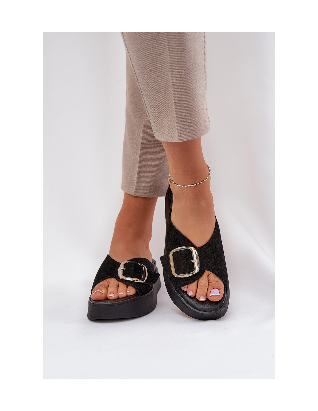 Šlepetės iš natūralios zomšos yra elegantiškas pasirinkimas vasaros dienoms. Pastatytos ant platformos, jos suteikia komfortą ir stabilumą einant. Didelė sagtis su reguliuojamu dirželiu priekyje leidžia puikiai priglusti prie pėdos, o minkštas vidpadis garantuoja komfortą visą dieną. Šios šlepetės yra puikus pasirinkimas daugeliui stilių! Renkantis dydį, vadovaukitės dydžių lentele.