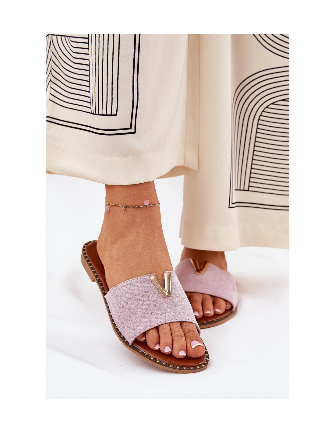 Moteriškos plokščios šlepetės – puikus pasirinkimas vasaros dienoms. Pagaminti iš malonios liesti ekologiškos zomšos, užtikrina patogumą dėvėti. Klasikinis dizainas buvo praturtintas dekoratyvinėmis detalėmis, kurios suteikia jiems elegantišką charakterį. Puikiai tinka tiek kasdieniam naudojimui, tiek vasaros pasivaikščiojimams. Jie puikiai dera prie suknelių, sijonų ir kelnių, suteikdami stilingą akcentą bet kokiai aprangai. Renkantis dydį, vadovaukitės dydžių lentele.