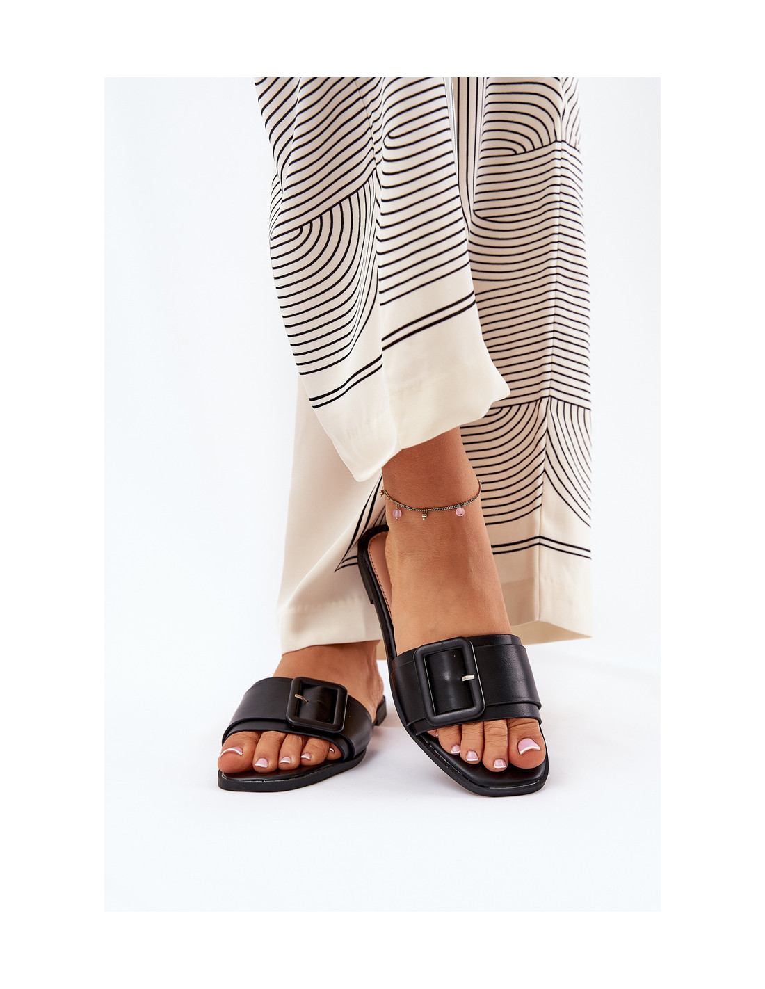 Klasikinės moteriškos šlepetės iš eko odos, ant plokščio kulno, kuriose patogumas derinamas su elegantiška išvaizda. Didelė diržo sagtis suteikia subtilaus charakterio. Puikiai tinkančios kasdieniam dėvėjimui, šios šlepetės puikiai dera su vasariškais stiliais, suteikia komforto ir paprastos elegancijos visą dieną. Renkantis dydį, vadovaukitės dydžių lentele.