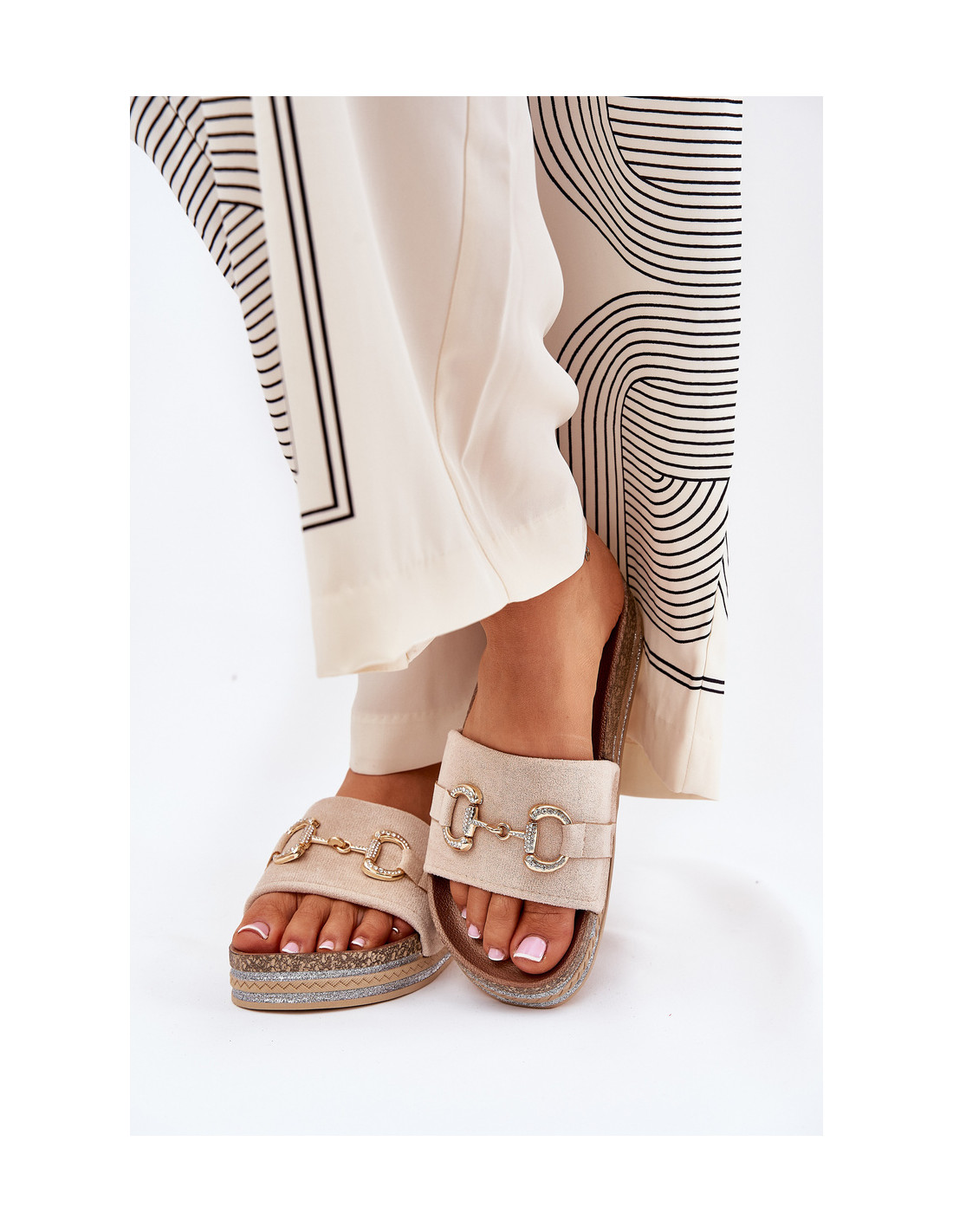 Moteriškos platformos šlepetės su aukso puošmena ir blizgučiais smėlio spalvos Morisela