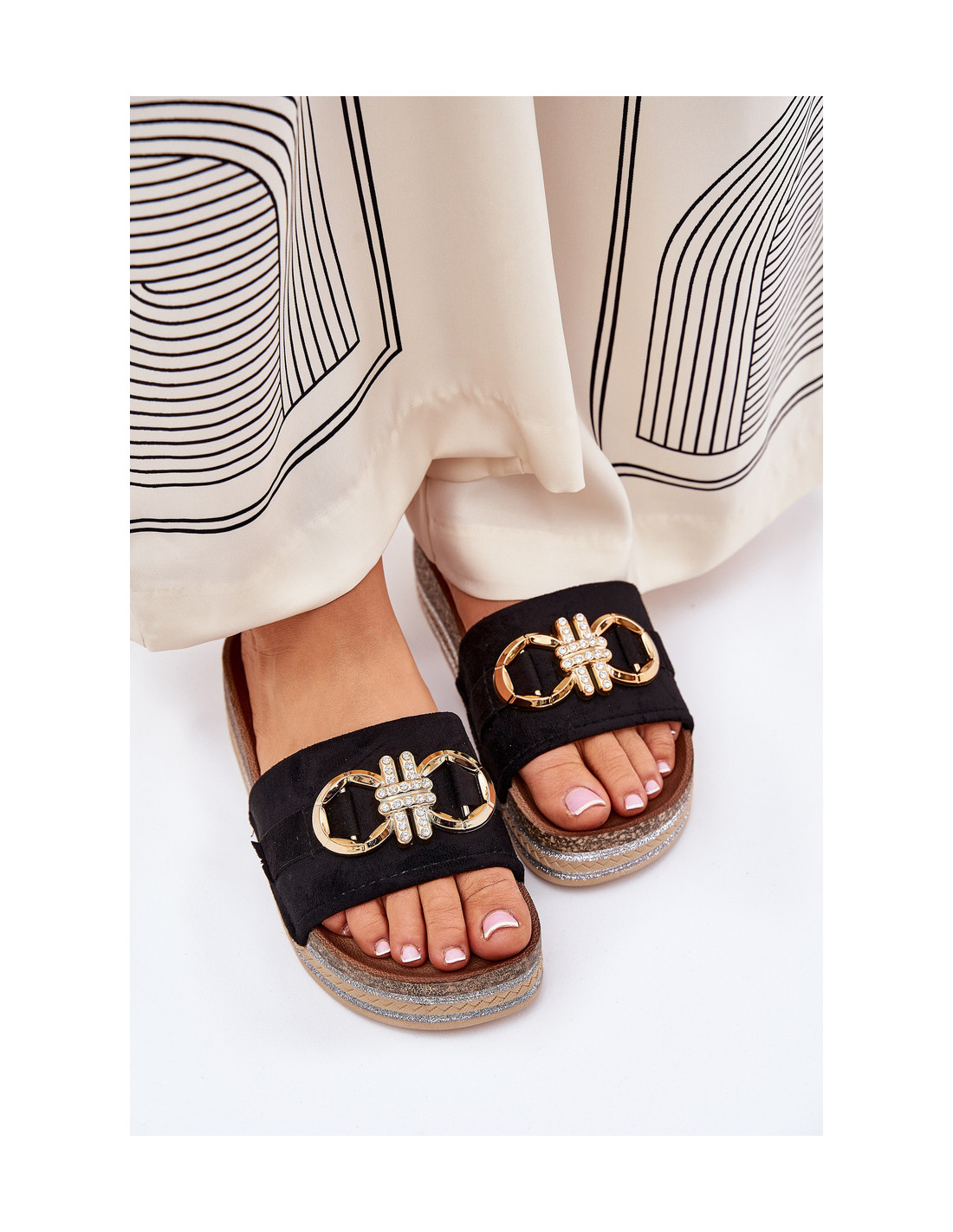 Šlepetės iš ekologiškos zomšos. Priekinė dalis dekoruota akį traukiančiu aukso elementu, suteikiančiu išskirtinio charakterio. Padėtos ant platformos su blizgučiais, jos suteikia blizgesio bet kokiam stiliui. Šios šlepetės yra puikus pasirinkimas vasaros dienoms, puikiai derančios prie suknelių, sijonų ar šortų, bet kuriam ansambliui suteikiančios modernumo. Renkantis dydį, vadovaukitės dydžių lentele.