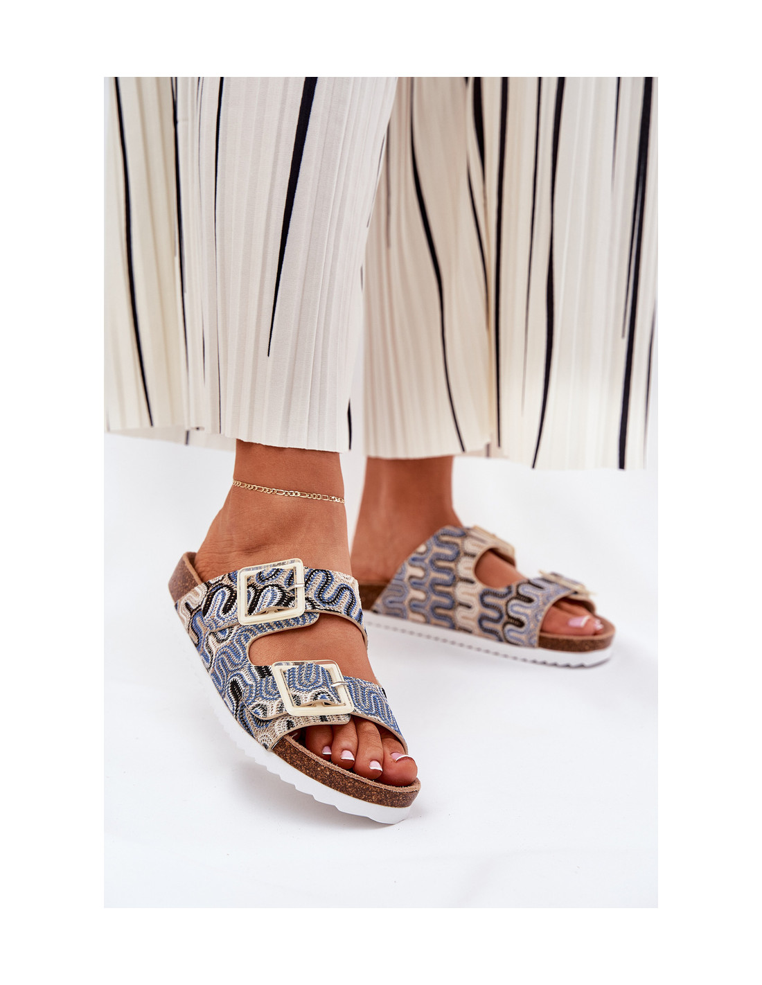 Raštuotos moteriškos šlepetės iš tekstilinės medžiagos, pastatytos ant kamštinės platformos, kuriose patogumas derinamas su madinga išvaizda. Dvi blizgučiais puoštos sagties dirželiai suteikia jiems nepakartojamo charakterio. Kontūruotas zomšinis vidpadis suteikia komfortą visą dieną. Šios šlepetės bus puikus pasirinkimas vasaros dienoms, puikiai derančios prie suknelių, sijonų ar šortų, suteikiančios lengvumo ir blizgesio bet kokiam stiliui. Renkantis dydį, vadovaukitės dydžių lentele.