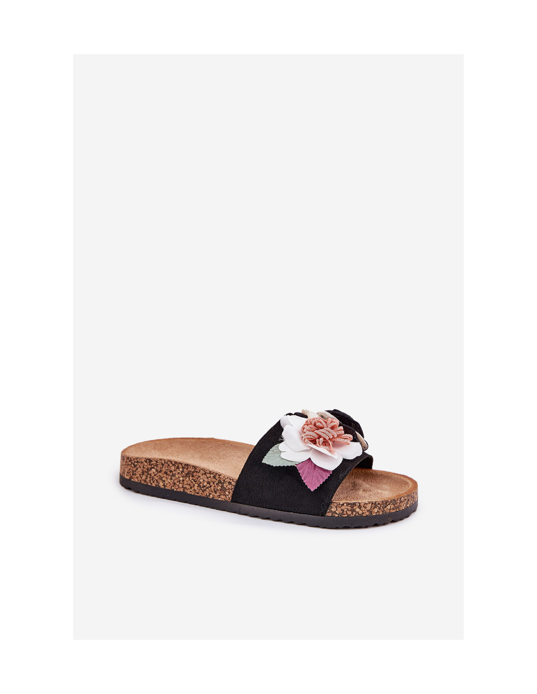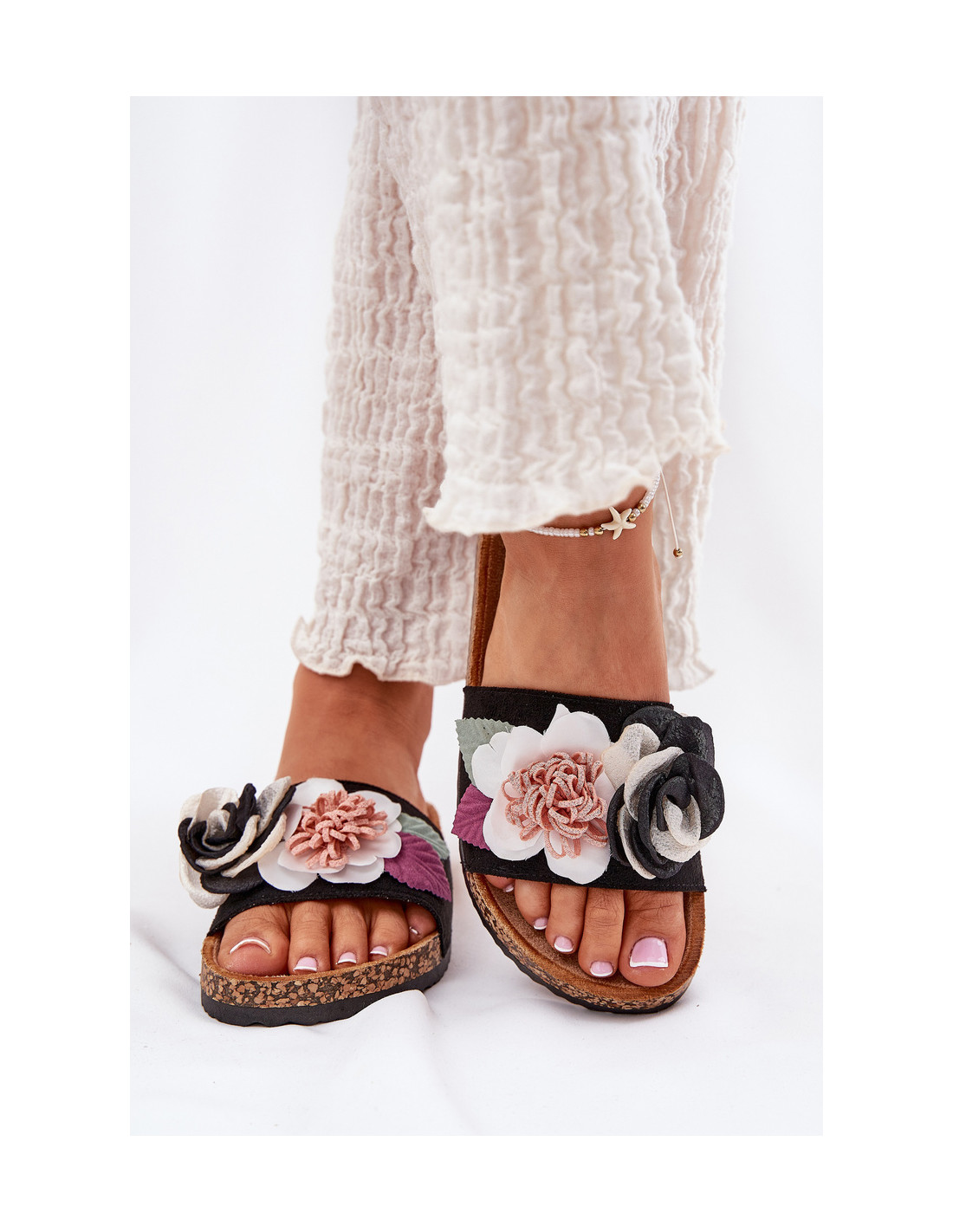 Moteriškos šlepetės su gėlėmis ant kamštinės platformos Black Zinrosa