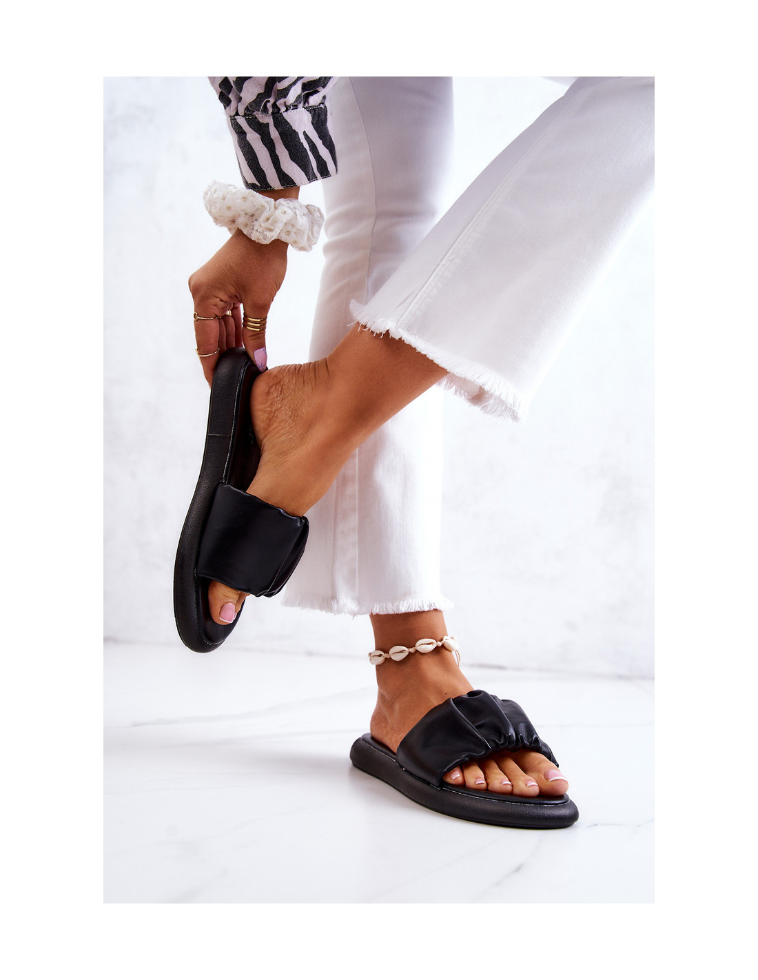 Elegantiškos moteriškos šlepetės turi minkštą ekologinės odos vidpadį. Elegantiški raukiniai iš eko odos leidžia batams atrodyti tikrai nuostabiai. Subtilus platforma ir padas pagamintas iš plastiko. Šios šlepetės užbaigs daugybę vasaros stilizacijų! Jie puikiai derės prie boho stiliaus. Sužavėkite išvaizda ir įsigykite juos šiandien! Būtinai peržiūrėkite visą mūsų moteriškų šlepečių kolekciją. Renkantis dydį, naudokite dydžių lentelę.