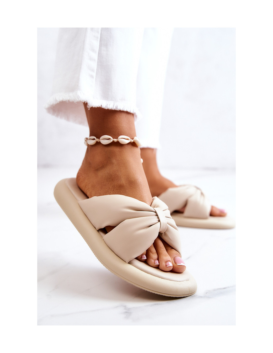 Elegantiškos moteriškos šlepetės atviru pirštu ir užapvalinta priekiu – madingiausias kirpimas šį sezoną! Šlepetės turi minkštą, eko odos įdėklą. Dirželiai pagaminti iš eko odos, yra storesni ir minkšti liesti. Plokščias padas su platforma pagamintas iš plastiko. Šios šlepetės užbaigs daugybę vasaros stilizacijų! Būtinai peržiūrėkite visą mūsų moteriškų šlepečių kolekciją. Renkantis dydį, naudokite dydžių lentelę.
