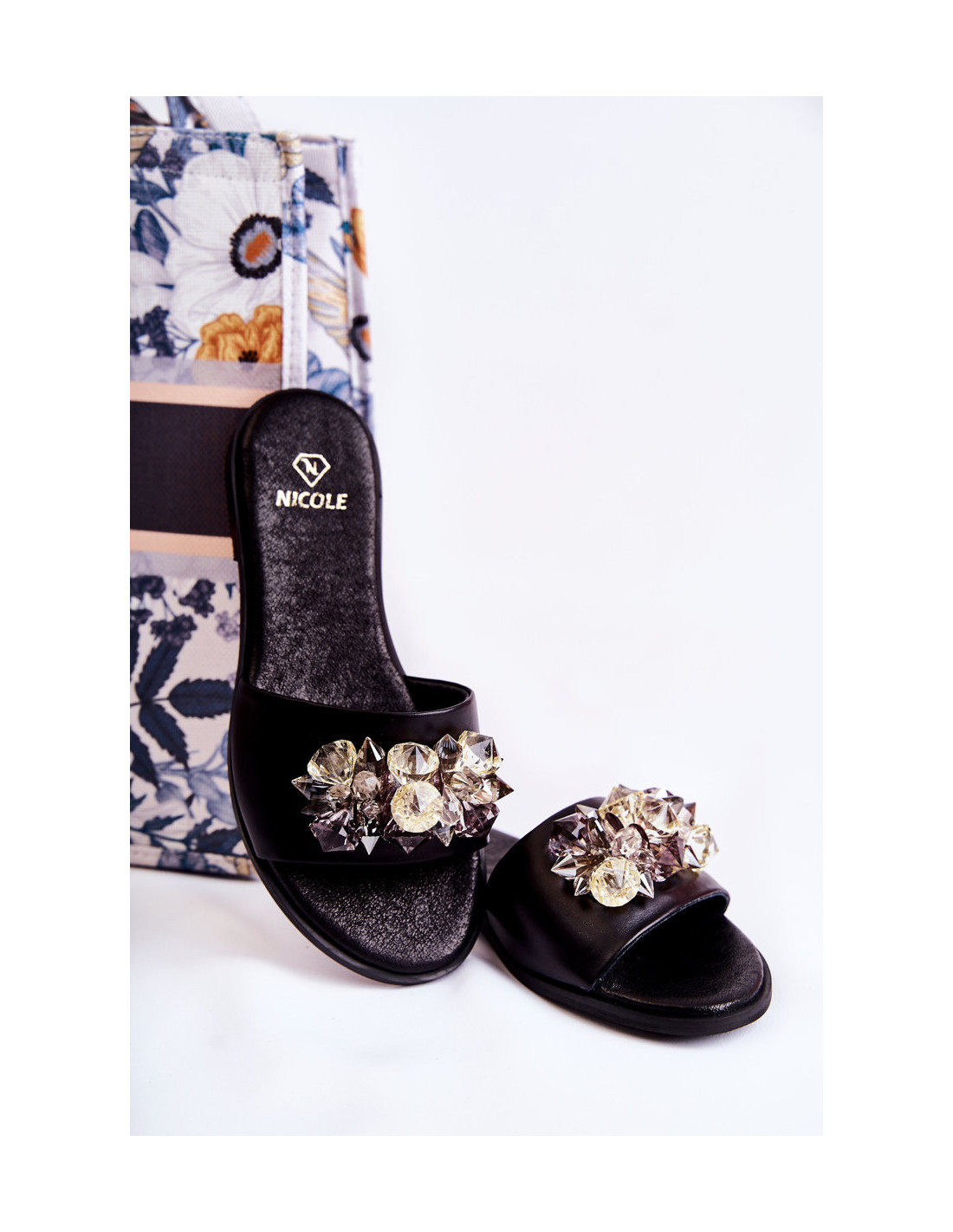 Klasikinės Nicole šlepetės. Batai yra pagaminti iš natūralios odos, atkreipiant dėmesį į detales. Jie turi priekinį ornamentą spalvotų kristalų pavidalu. Minkštas vidpadis taip pat pagamintas iš natūralios odos, todėl naudojimo komfortas yra dar didesnis. Batai, montuojami ant plokščio kulno. Būtinai peržiūrėkite visą mūsų Nicole batų kolekciją. Renkantis dydį, naudokite dydžių lentelę.