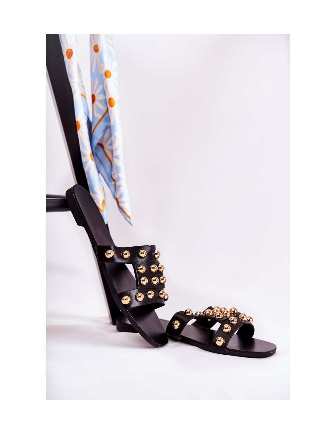 Klasikinių moteriškų šlepečių, pagamintų iš ekologiškos odos, petnešėlės yra švelniai iškirptos. Jie buvo dekoruoti veidrodiniais elementais pusrutulių pavidalu. Minkštas vidpadis iš eko odos. Batai buvo montuojami ant plokščio kulno. Padas pagamintas iš guminės medžiagos, kuri papildomai neslysta. Puikus modelis, kuris puikiai tiks karštomis dienomis! Renkantis dydį, naudokite dydžių lentelę.