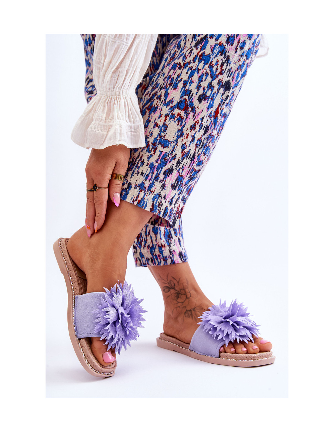 Moteriškos šlepetės su įspūdingu papuošimu priekyje. Pagaminta iš ekologiškos zomšos, o ornamentas iš audinio. Vidpadis ir padas pagaminti iš guminės medžiagos. Kojos pirštas atviras, šiek tiek kvadratinis. Virvelės aplink padą. Šlepetės ant plokščio kulno, neslidžiu padu. Šlepetės yra erdvios, todėl puikiai tiks karštomis dienomis! Modelis, kurį turėtumėte turėti! Nelaukite ir pirkite! Renkantis dydį, naudokite dydžių lentelę.