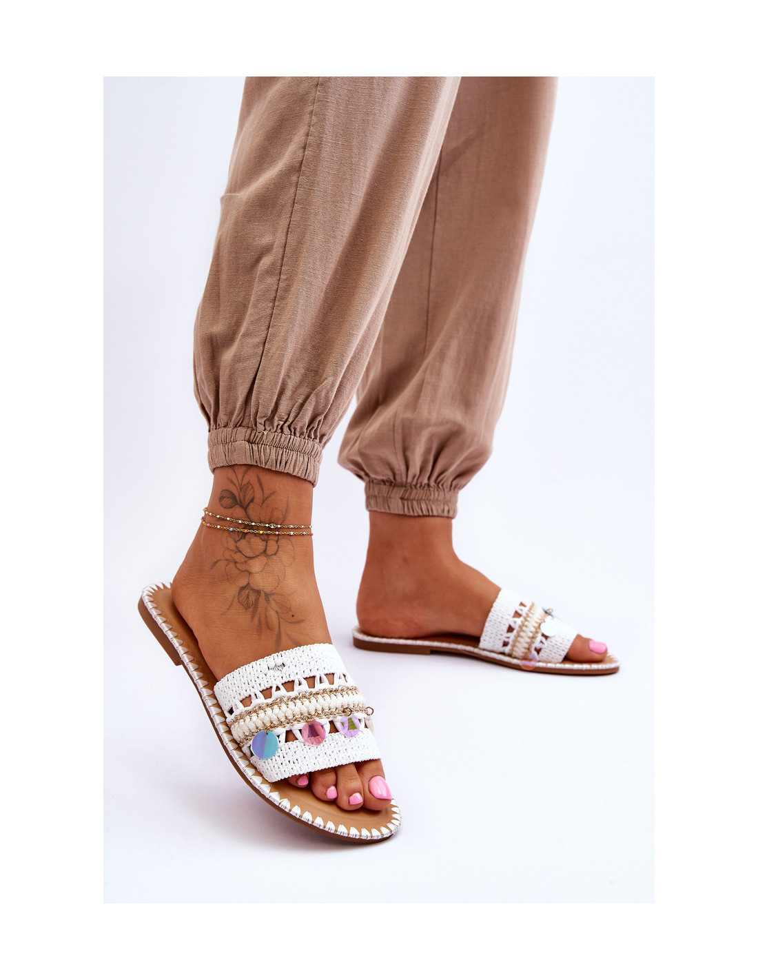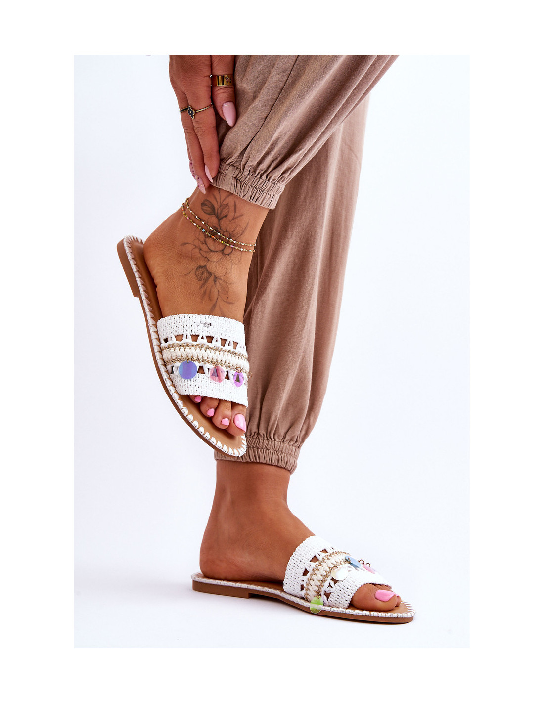Madingos moteriškos šlepetės pagamintos iš plastiko ir audinio derinio. Šis modelis turi dekoratyvinius apskritimus ir lureksą, ty blizgantį siūlą. Klasikinis slystantis modelis, plokščiu kulnu ir neslystančiu padu. Eko odos įdėklas taip pat buvo papuoštas siūlais. Rinkdamiesi dydį žiūrėkite dydžių lentelę.