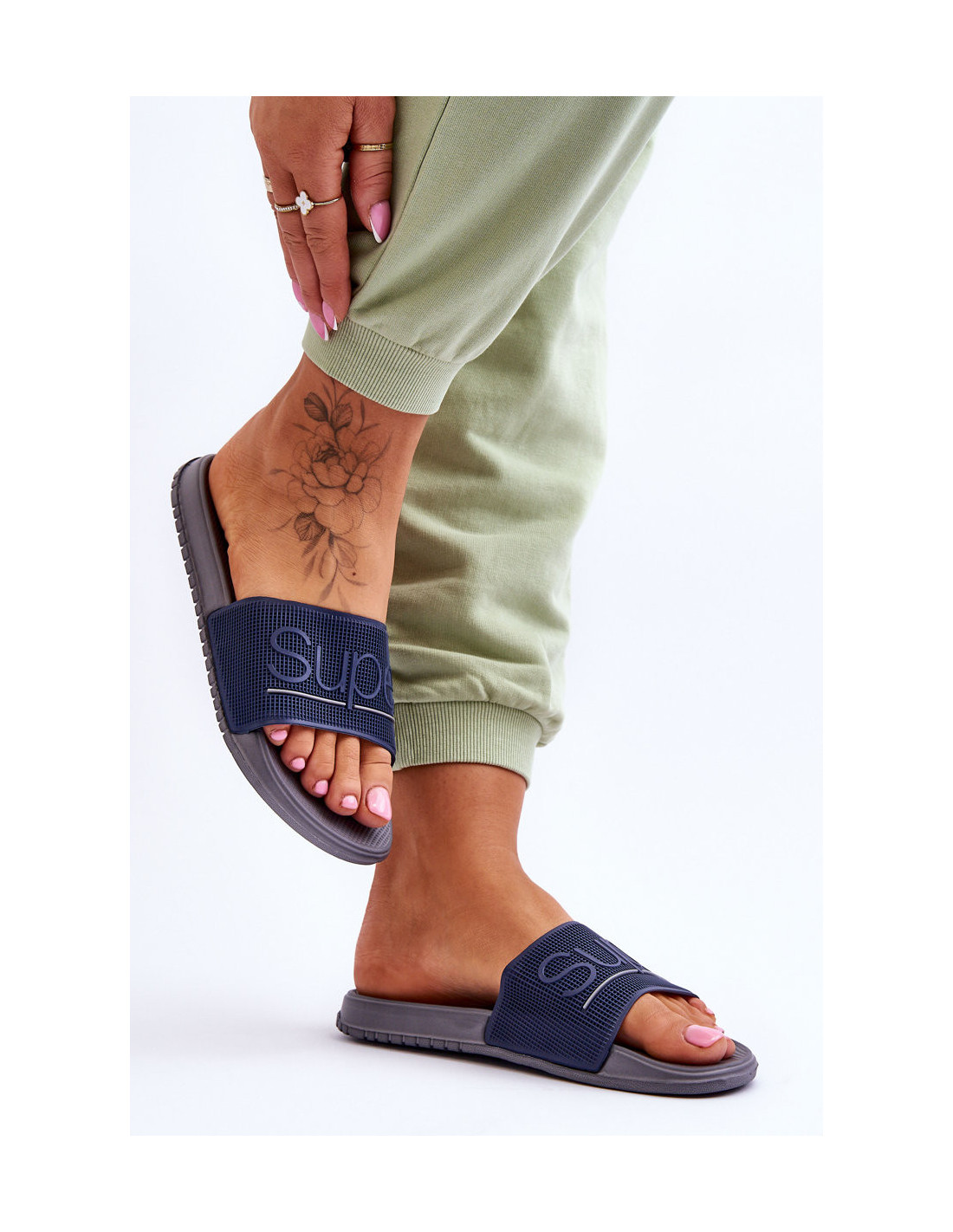Šios moteriškos šlepetės yra puikus modelis karštomis dienomis! Jie itin lengvi ir patogūs. Juostelė su užrašu pagaminta iš guminės medžiagos, o įdėklas su platforma iš putplasčio. Šis modelis yra klasikinis užsegamas. Šlepetės buvo dedamos ant subtilios platformos. Jie taip pat puikiai tiks kaip šlepetės baseine. Rinkdamiesi dydį žiūrėkite dydžių lentelę.