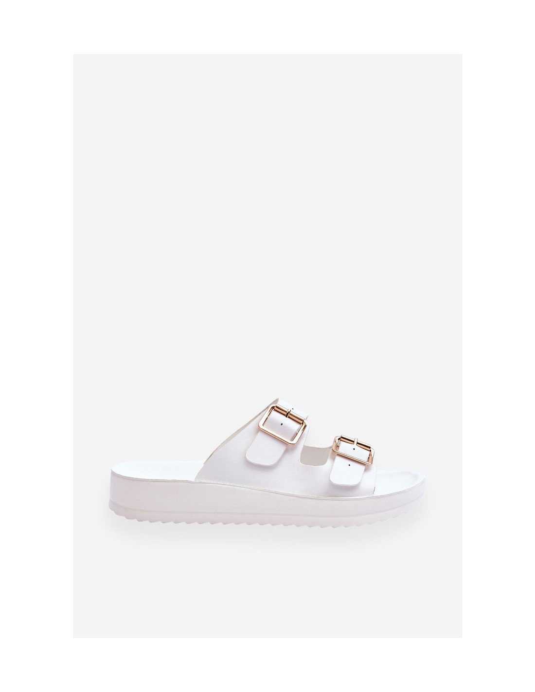 Klasikiniai, moteriški batai pagaminti iš eko odos. Jie turi dekoratyvinę sagtį su reguliuojamais dirželiais. Šis modelis buvo sumontuotas ant plastikinės platformos. Tobula avalynė vasaros sezonui. Šios šlepetės itin erdvios ir patogios. Jūs tikrai turėtumėte juos turėti! Rinkdamiesi dydį, žiūrėkite dydžių lentelę.