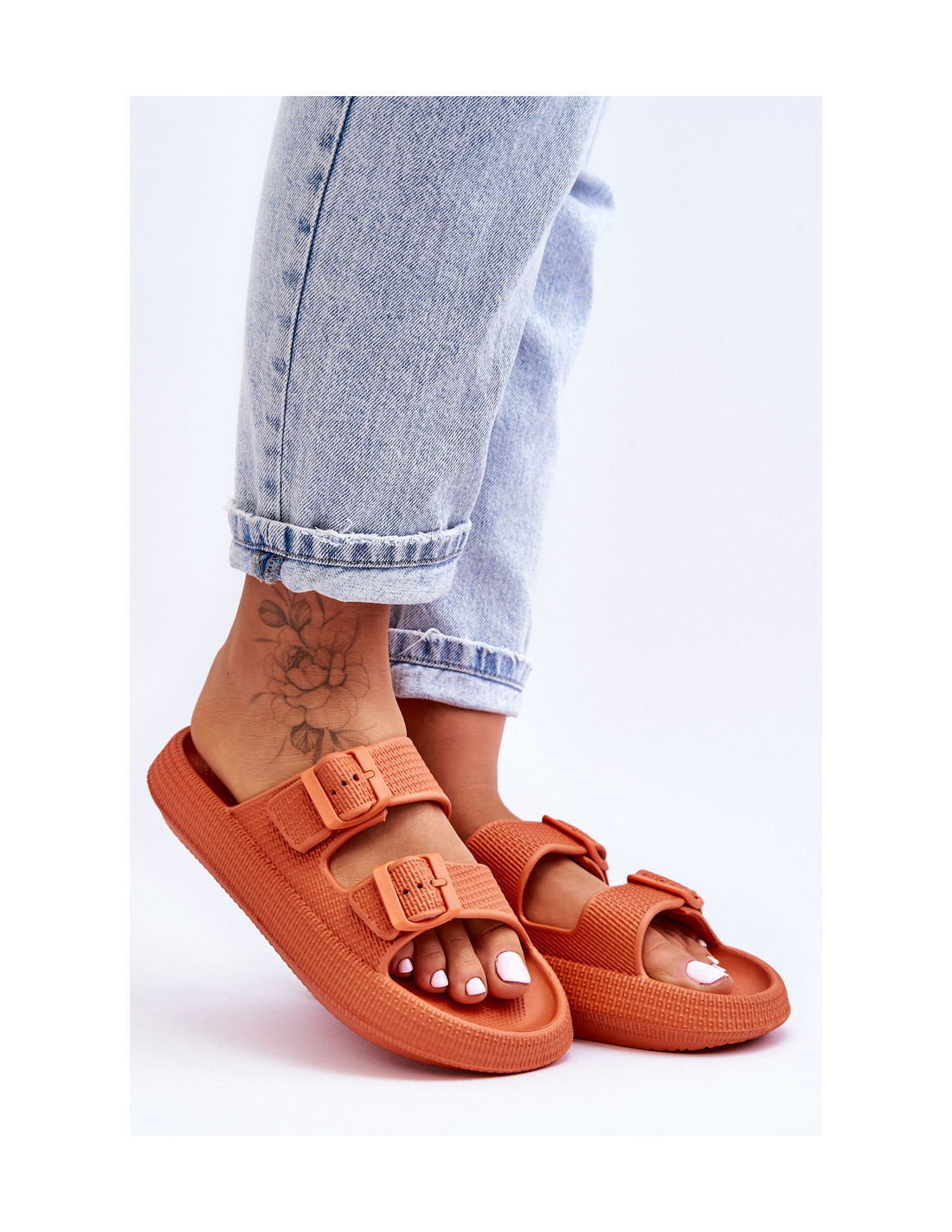 Klasikinės moteriškos šlepetės pagamintos tik iš porolono. Jie turi plastikines sagtis su reguliuojamais dirželiais. Šis modelis buvo sumontuotas ant masyvios platformos. Tobula avalynė vasaros sezonui. Šios šlepetės itin erdvios ir patogios. Jie taip pat puikiai tinka prie baseino ar paplūdimio. Rinkdamiesi dydį, žiūrėkite dydžių lentelę.