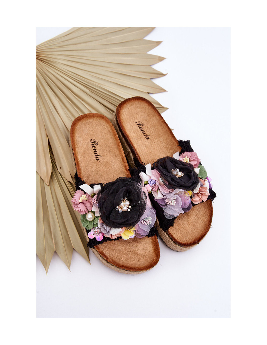 Unikalios moteriškos šlepetės su nuostabiomis dekoracijomis – medžiaginių gėlių ir perlų pavidalu. Įrengtas ant masyvios platformos, puoštos džiuto pyne. Šlepetės turi profiliuotą, ekologišką zomšinį vidpadį. Šis modelis tikrai išskirs jus iš minios! Rinkdamiesi dydį, žiūrėkite dydžių lentelę.