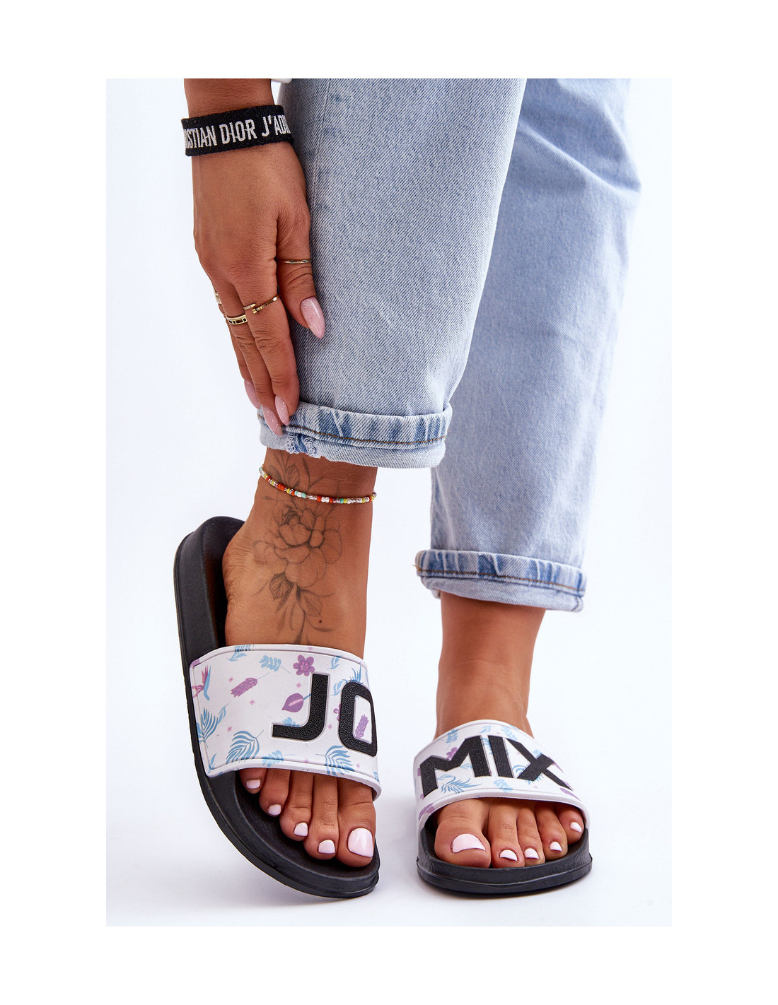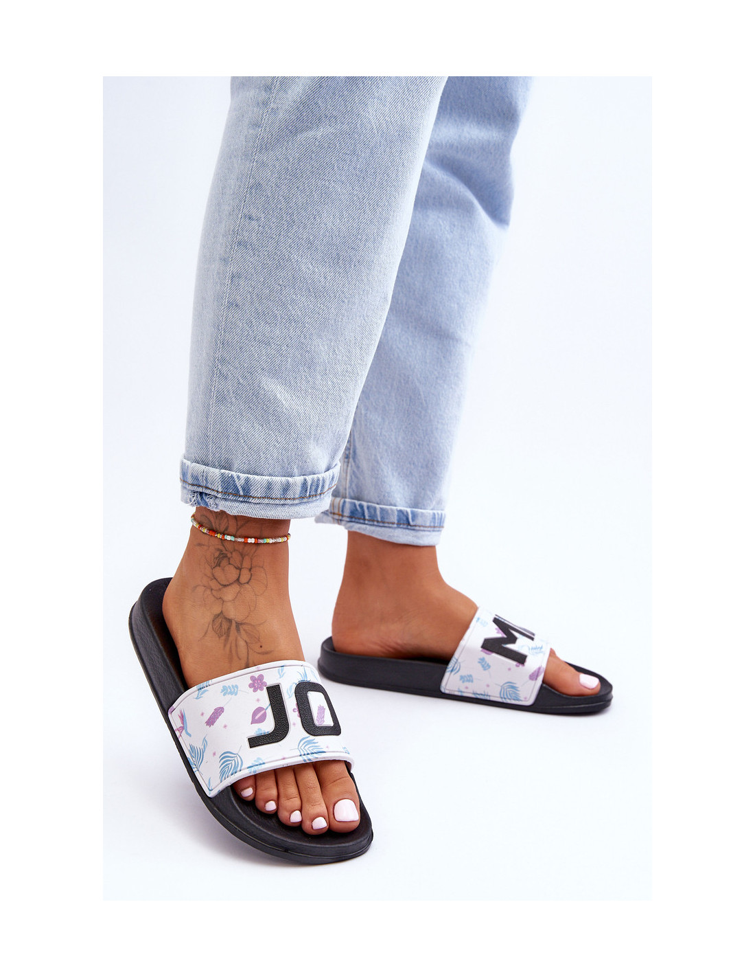 Moteriškos šlepetės pagamintos iš porolono. Ant juostelės yra madingos dekoracijos ir užrašas. Šis modelis buvo sumontuotas ant subtilios platformos. Šios šlepetės tiks daugeliu atvejų, pvz., prie baseino ar paplūdimio. Šis itin lengvas modelis yra labai patogus naudoti. Rinkdamiesi dydį, žiūrėkite dydžių lentelę.