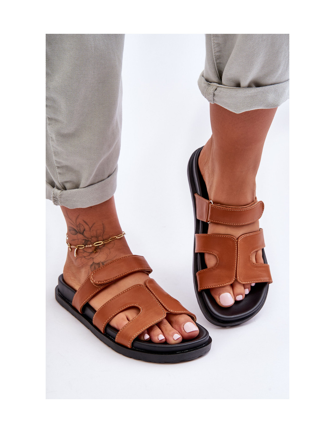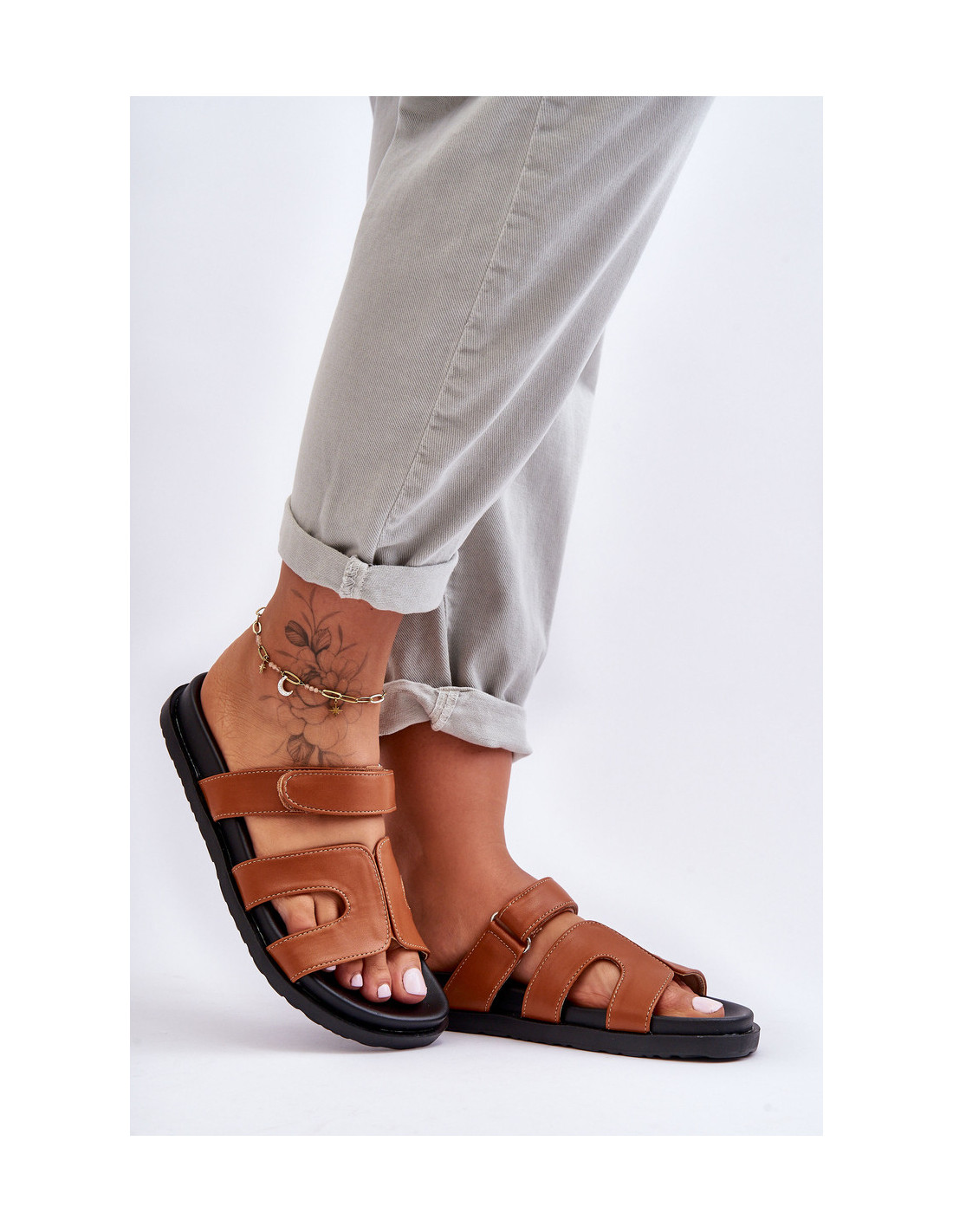 Odinės klasikinės moteriškos šlepetės su lipnia juostele, rudos spalvos Amedon