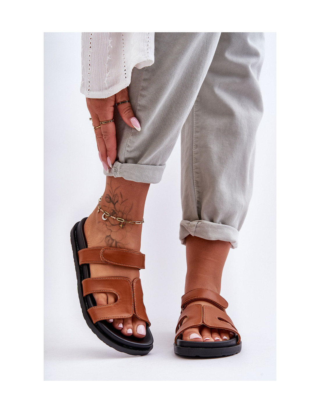 Šios klasikinės ir patogios moteriškos šlepetės buvo pagamintos iš ekologiškos odos. Jie buvo pastatyti ant lengvos platformos. Gerai profiliuotas vidpadis suteiks patogumo naudojant. Šis modelis praturtintas velcro užsegimu, kurio dėka avalynė gali būti priderinta prie kojos sandarumo. Renkantis dydį, vadovaukitės dydžių lentele.
