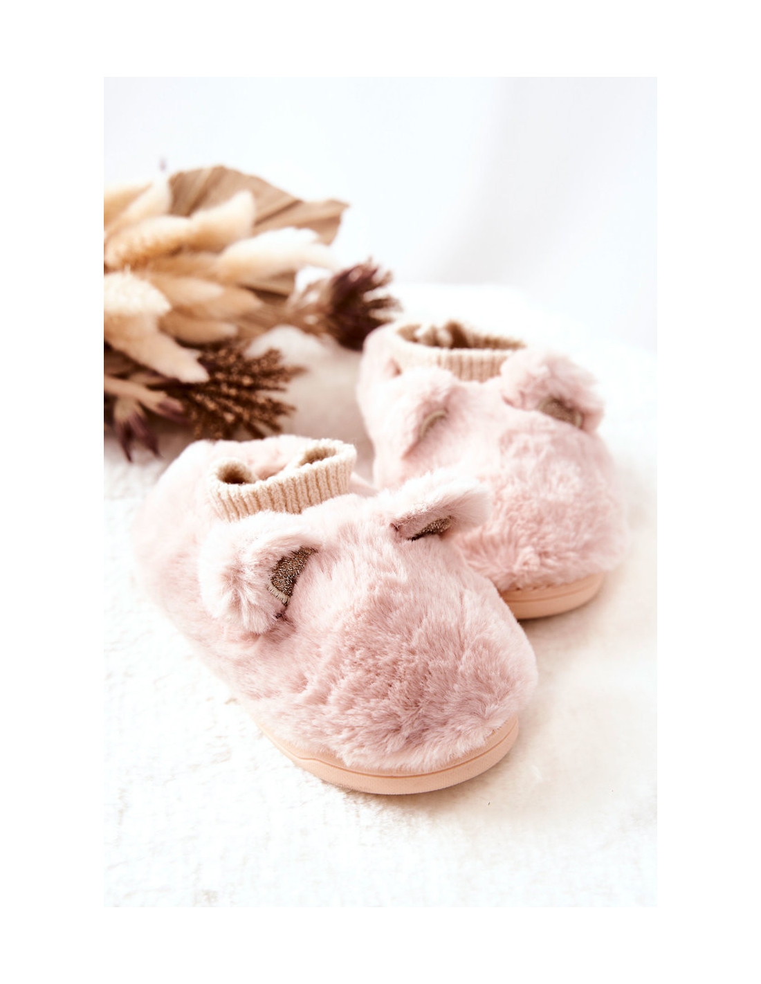 Nuostabios šlepetės iš pūkuotos medžiagos, malonios liesti. Jų priekyje yra ausų atvartai su blizgančiais siūlais ir ausinė, kuri gali prisitaikyti prie kojos dydžio. Šlepečių viduje yra švelnaus kailio pavidalo šildymas. Storas padas apsaugo nuo šaltos žemės. Šios šlepetės puikiai tiks šaltomis žiemos dienomis namuose! Rinkdamiesi dydį, vadovaukitės dydžių lentele.