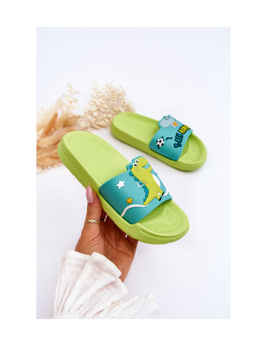 Unikalios, vaikiškos šlepetės yra pagamintos iš guminės medžiagos viršuje. Jų priekyje yra dinozaurų motyvai. Šlepetės uždedamos ant subtilios platformos, pagamintos iš putplasčio. Jūsų vaikui šis modelis tikrai patiks! Būtinai peržiūrėkite kitus vaikiškų šlepečių modelius!Rinkdamiesi dydį, vadovaukitės dydžių lentele.