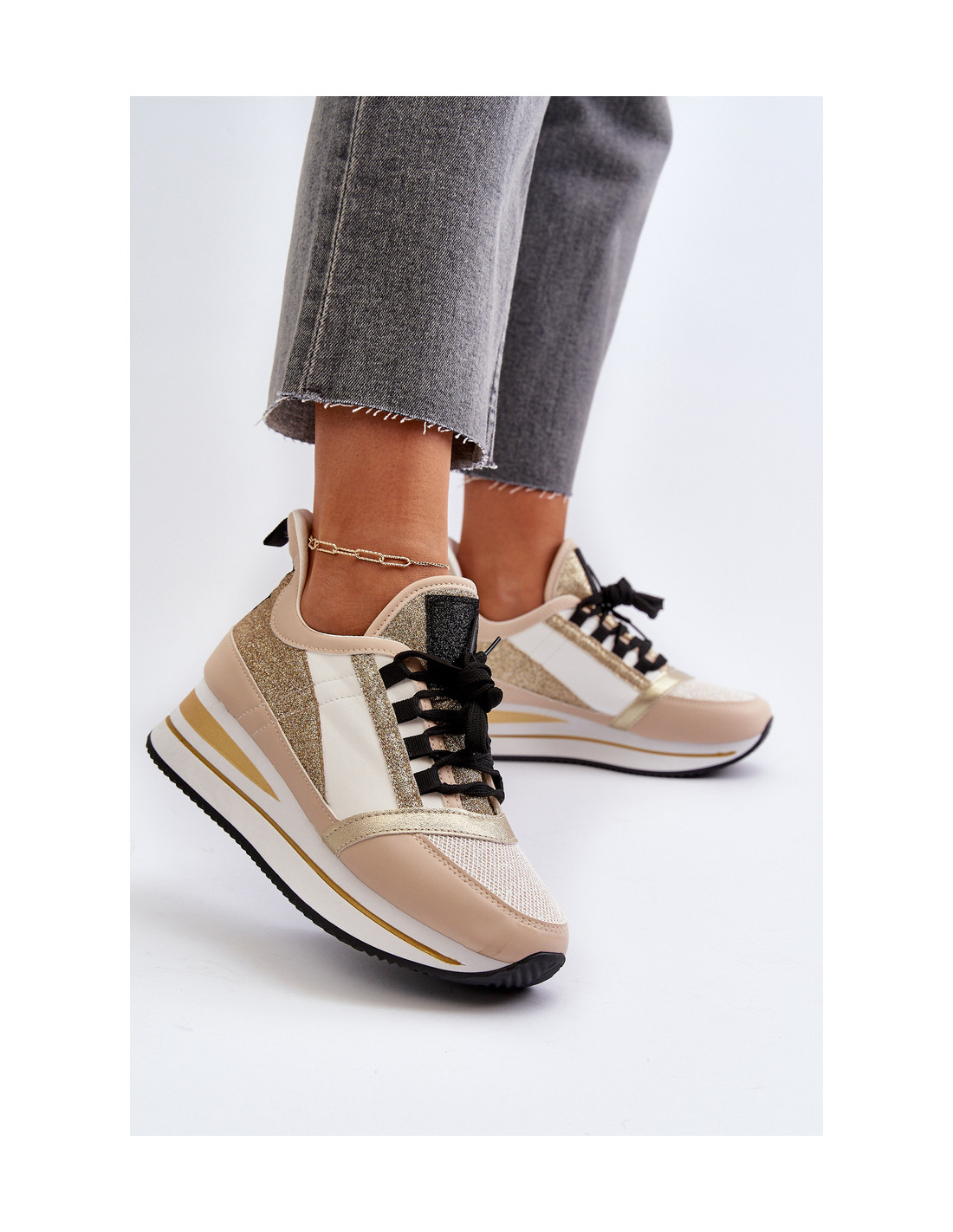 Moteriški sportbačiai – tai stiliaus, patogumo ir unikalios išvaizdos derinys. Pastatykite ant platformos ir pleišto. Blizgučiais dekoruota viršutinė dalis suteikia jiems išskirtinio blizgesio ir patrauklumo. Iš porolono pagamintas vidpadis taip pat yra išimamas, todėl lengviau prižiūrėti batus. Su šiuo modeliu galite sukurti daugybę puikių stilių! Renkantis dydį, vadovaukitės dydžių lentele.