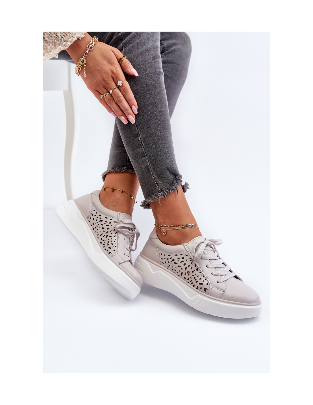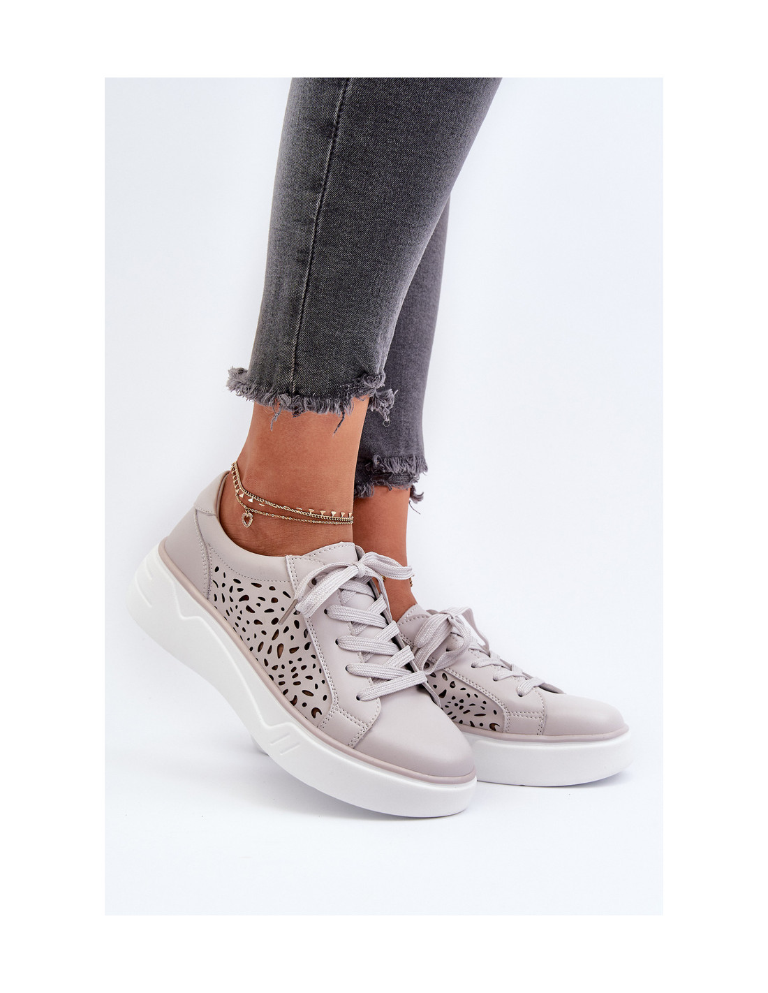 Moteriški ažūriniai sportbačiai ant platformos Oda Pilka Peilaeno