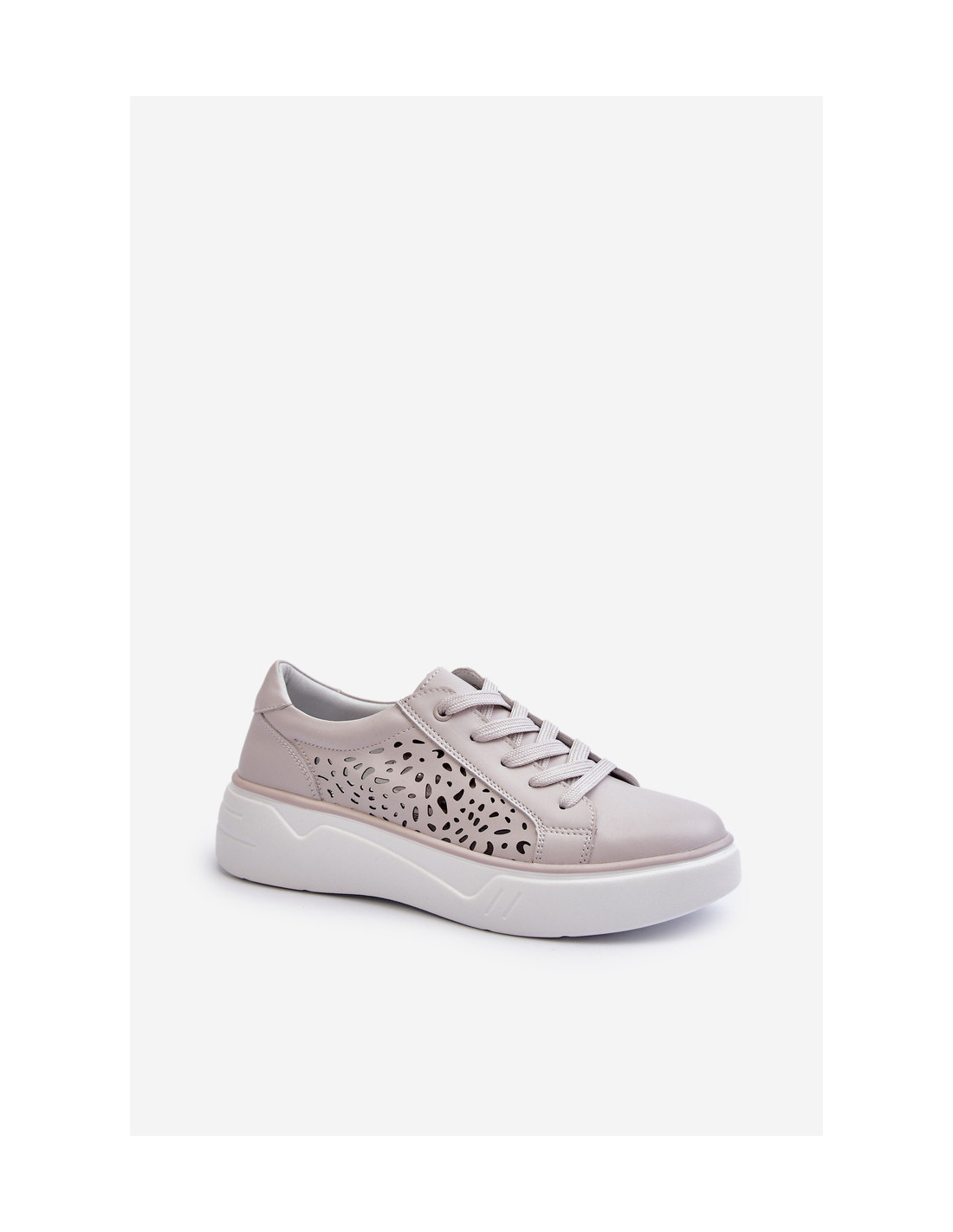 Moteriški sportbačiai iš aukštos kokybės natūralios odos. Ažūrinė viršutinė dalis suteikia originalumo. Pastatykite ant platformos, kuri užtikrina stabilumą. Suapvalinti kojų pirštai. Dėl minkšto įdėklo labai patogu nešioti net visą dieną. Renkantis dydį, vadovaukitės dydžių lentele.