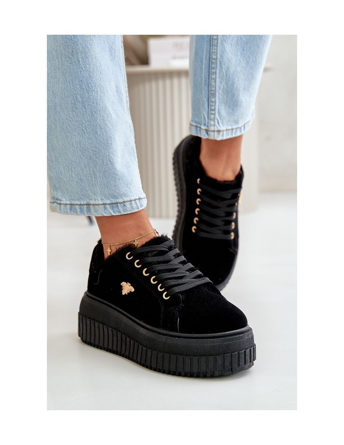 Moteriški sportbačiai masyviu padu – madingas ir patogus pasirinkimas šaltesnėms dienoms. Batų vidus apšiltintas minkštu kailiuku, kuris užtikrina šilumą ir komfortą. Suapvalinti kojų pirštai, kurie suteikia klasikinės išvaizdos ir suteikia papildomos erdvės kojų pirštams, padidindami komfortą. Viršuje yra aukso spalvos detalė, kuri suteikia elegancijos ir stiliaus, patraukia dėmesį. Šie sportbačiai puikiai tiks tiek prie kasdieninio stiliaus, tiek prie kasdieniškesnių komplektų, garantuojantys komfortą ir madingą išvaizdą visą dieną. Renkantis dydį, vadovaukitės dydžių lentele.