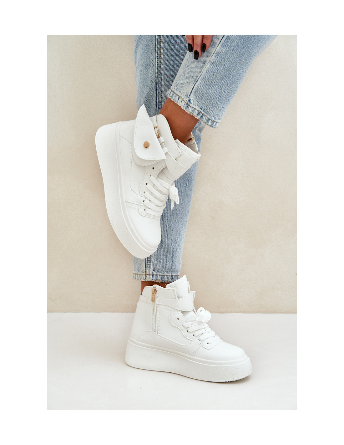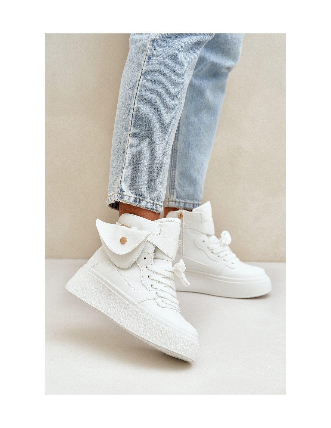 Moteriški aukšti sportbačiai iš aukštos kokybės eko odos – modernaus stiliaus ir patogumo derinys. Ant masyvios platformos jie suteikia komfortą ir papildomą amortizaciją. Viršutinė dalis buvo praturtinta mažu, nuimamu maišeliu, suteikiančiu originalumo. Modelis išsiskiria suapvalintais pirštais ir klasikiniais raišteliais, kurie leidžia puikiai priglusti prie pėdos. Sportbačiai yra puikus miesto stiliaus elementas, suteikiantis madingą gatvės aprangos išvaizdą. Puikus pasirinkimas moterims, kurios vertina funkcionalumą ir unikalų dizainą! Renkantis dydį, vadovaukitės dydžių lentele.