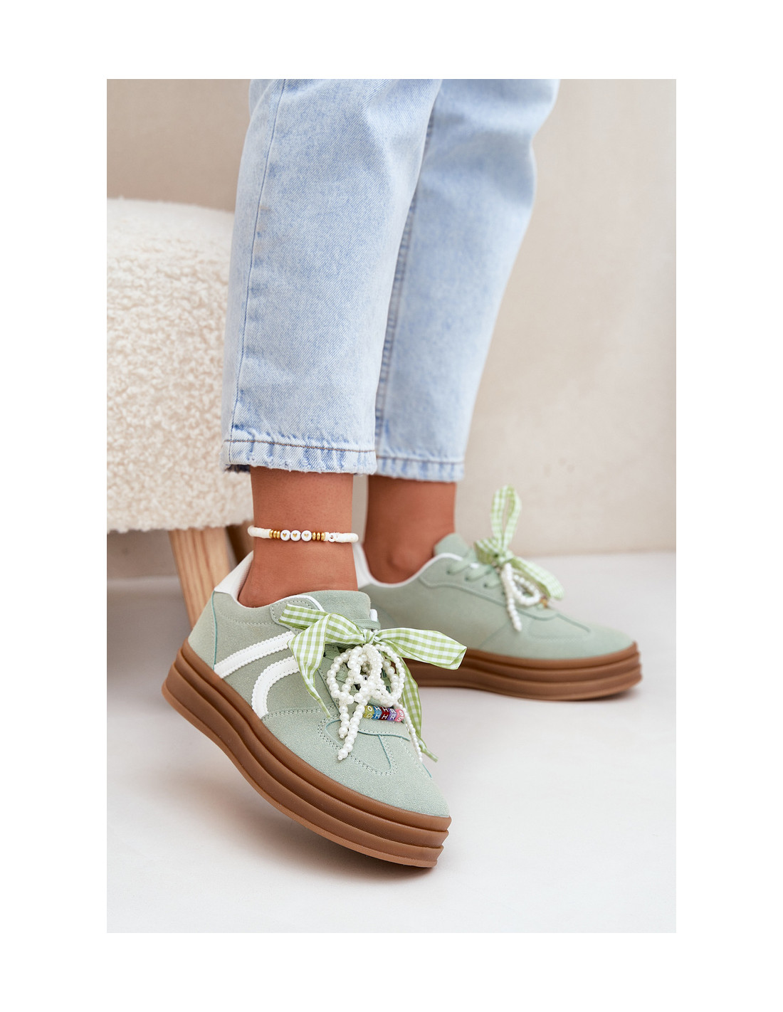 Stilingi sportbačiai iš ekologiškos zomšos – puikus pasirinkimas komfortą ir madingą išvaizdą vertinantiems žmonėms. Platformos dėka avalynė ne tik pakelia siluetą, bet ir nuostabiai pabrėžia šiuolaikišką stilių. Nėriniai puošti mielais segtukais, kurie suteikia mergaitiško žavesio ir išskirtinumo. Šie sportbačiai puikiai tiks prie kasdienės aprangos! Renkantis dydį, vadovaukitės dydžių lentele.