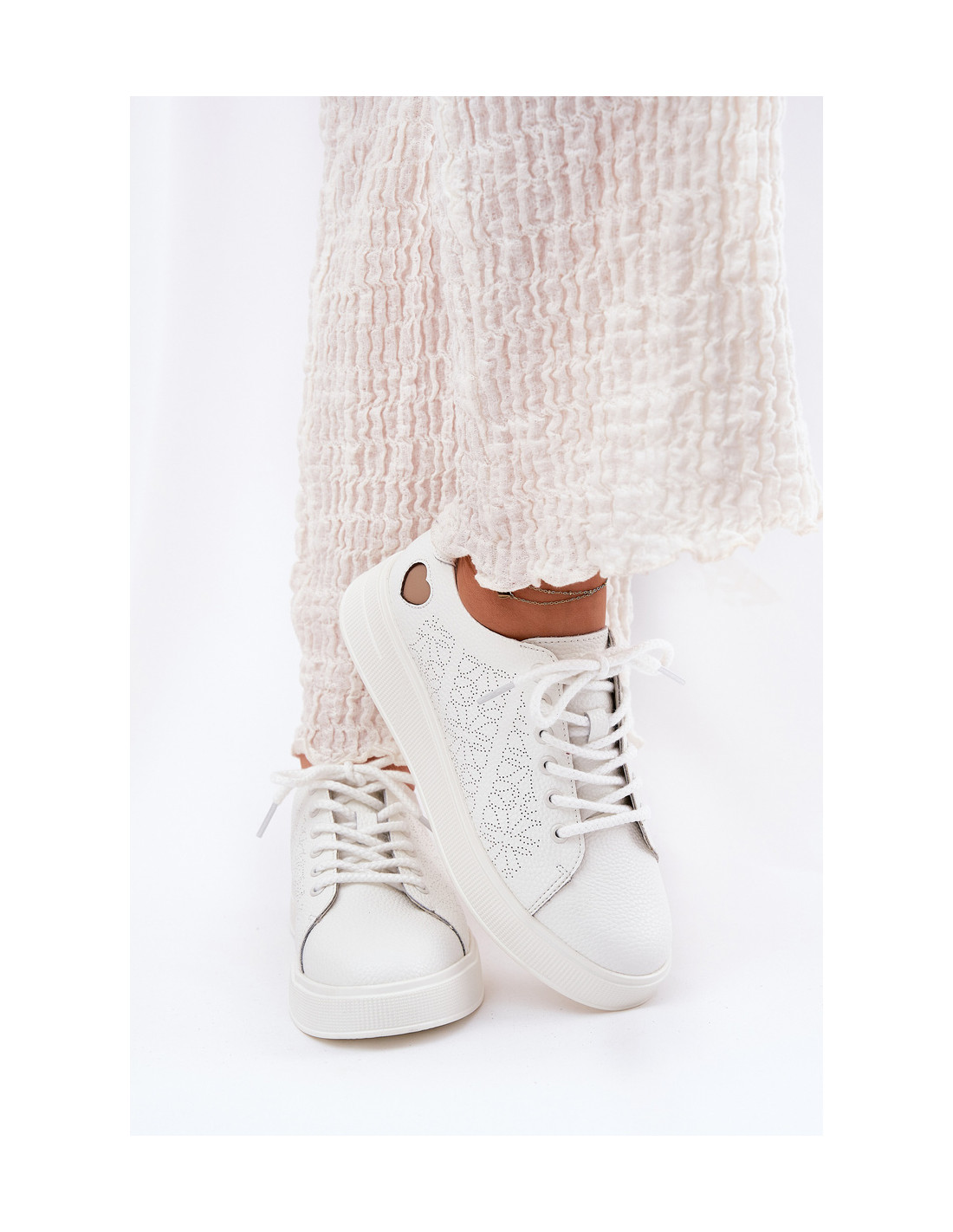 Moteriški sportbačiai iš prekės ženklo Vinceza. Pagaminta iš natūralios odos. Nustatyti ant platformos. Suapvalinti kojų pirštai. Viršus puoštas subtiliu ažūriniu raštu ir širdele. Minkštas odinis vidpadis užtikrina komfortą ir pakankamą amortizaciją. Lengvas ir patogus, puikiai tinka pavasario ir vasaros stiliams! Renkantis dydį, vadovaukitės dydžių lentele. 36-23,5/37-24/38-25/39-25,5/40-26,5/41-27cm