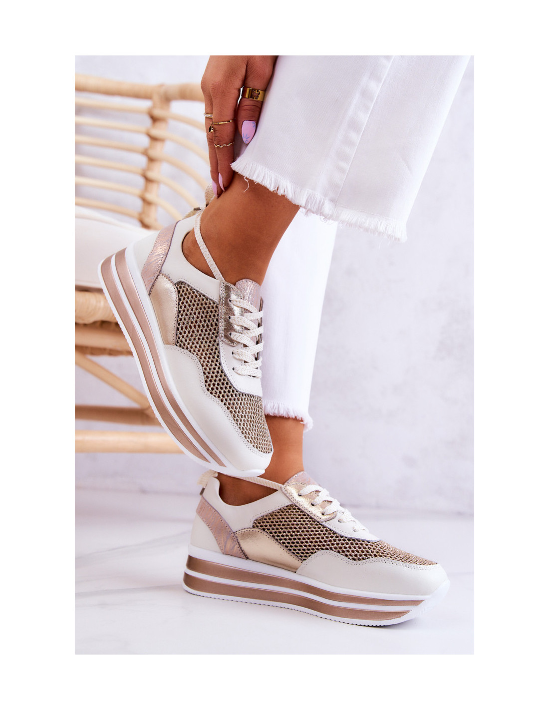 Madingi sportiniai bateliai ant subtilaus pleišto kulno. Jie taip pat turi platformą. Vidpadis pagamintas iš natūralios odos, kurią labai patogu naudoti. Batų viršutinė dalis pagaminta iš blizgios tinklinės medžiagos ir natūralios odos. Jie turi surišimą plokščiais raišteliais, kurie leis tinkamai prisitaikyti prie kojos pločio. Puikiai tiks pavasario ir vasaros sezonui! Renkantis dydį, naudokite dydžių lentelę.