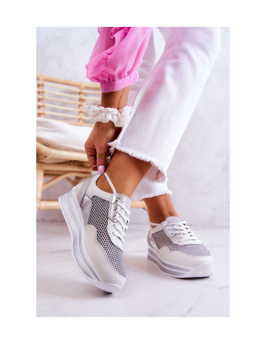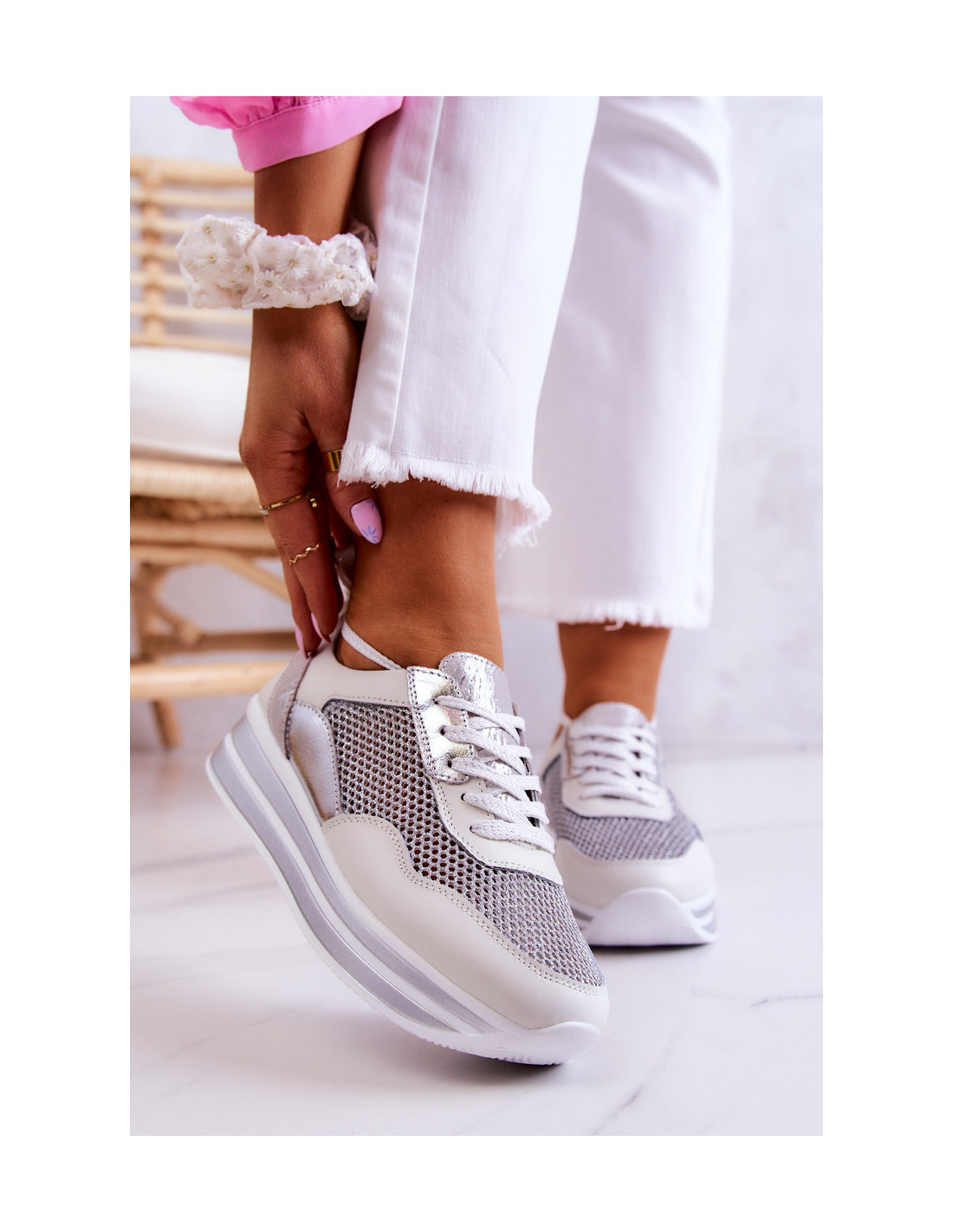 Madingi sportiniai bateliai ant subtilaus pleišto kulno. Jie taip pat turi platformą. Vidpadis pagamintas iš natūralios odos, kurią labai patogu naudoti. Batų viršutinė dalis pagaminta iš blizgios tinklinės medžiagos ir natūralios odos. Jie turi surišimą plokščiais raišteliais, kurie leis tinkamai prisitaikyti prie kojos pločio. Puikiai tiks pavasario ir vasaros sezonui! Renkantis dydį, naudokite dydžių lentelę.