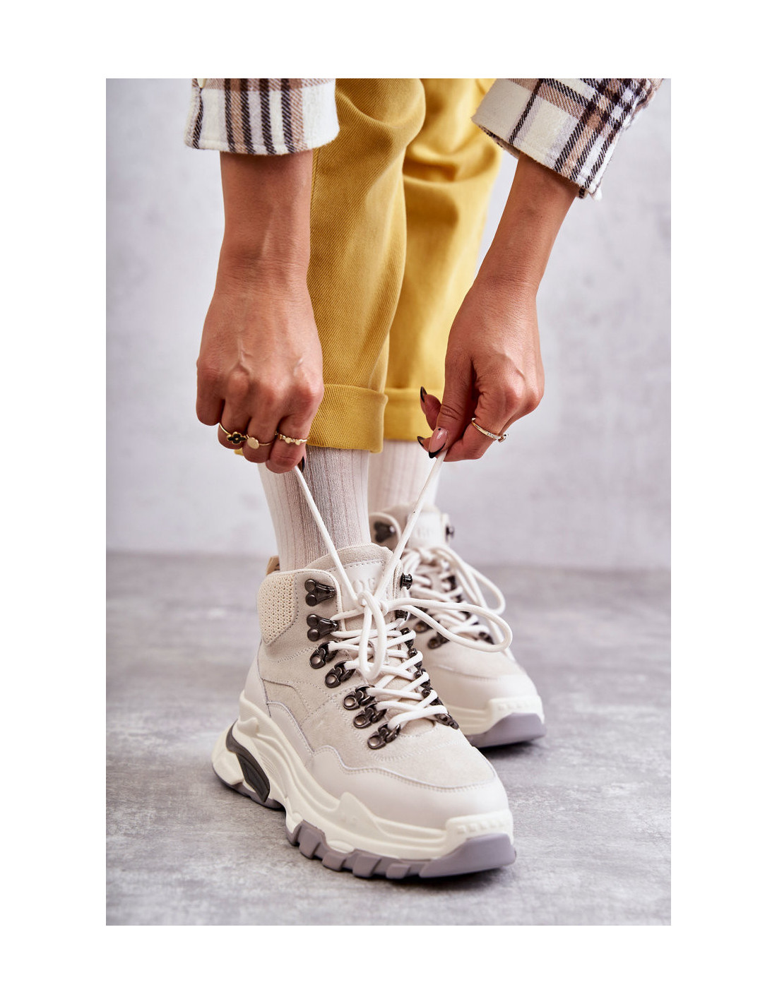 GOE sportiniai bateliai suteiks jums patogumo ir komforto naudojant. Pagaminta iš natūralios zomšos ir natūralios odos derinio, o vidpadis – iš ekologiškos odos. Klasikinis raištytas modelis. Šie batai buvo montuojami ant masyvios platformos. Aukšta viršutinė dalis stabilizuos koją pasivaikščiojimų ar kelionių metu. Šis modelis turėtų būti jūsų drabužių spinta! Renkantis dydį, naudokite dydžių lentelę.
