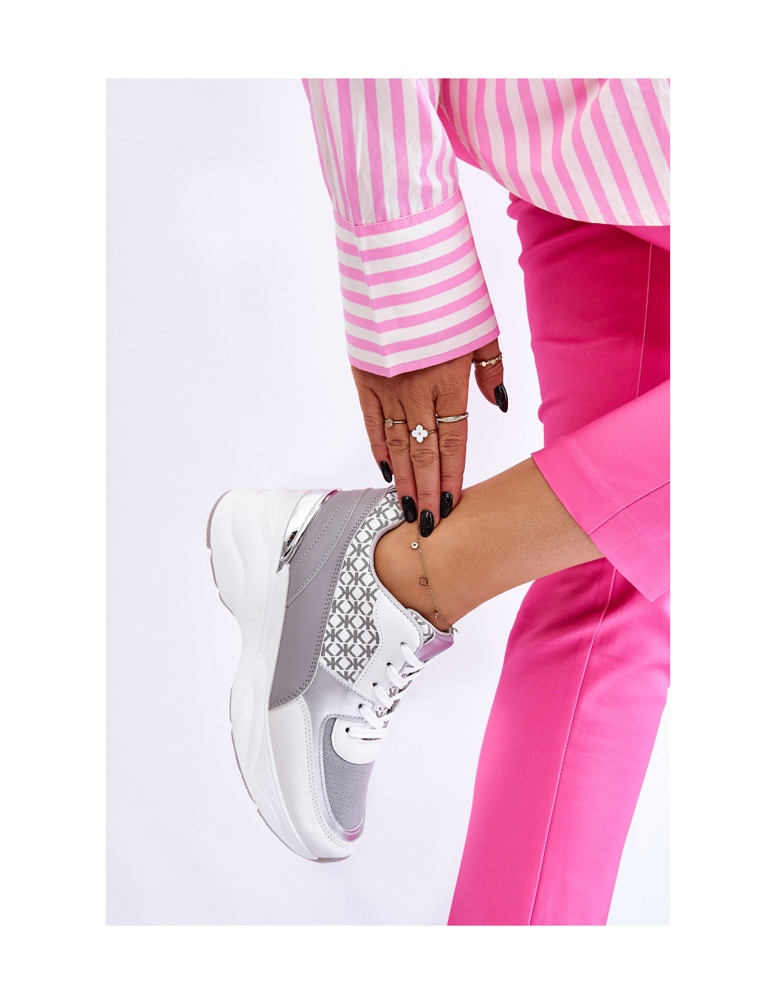 Patogūs moteriški sportiniai bateliai turi subtilų pleištą ir platformą. Modelis pagamintas iš eko odos ir tekstilės medžiagos derinio tinklelio pavidalu. Klasikinis suvarstomas modelis. Minkštas vidpadis leis patogiai dėvėti šią avalynę net ir visą dieną! Rinkdamiesi dydį, žiūrėkite dydžių lentelę.