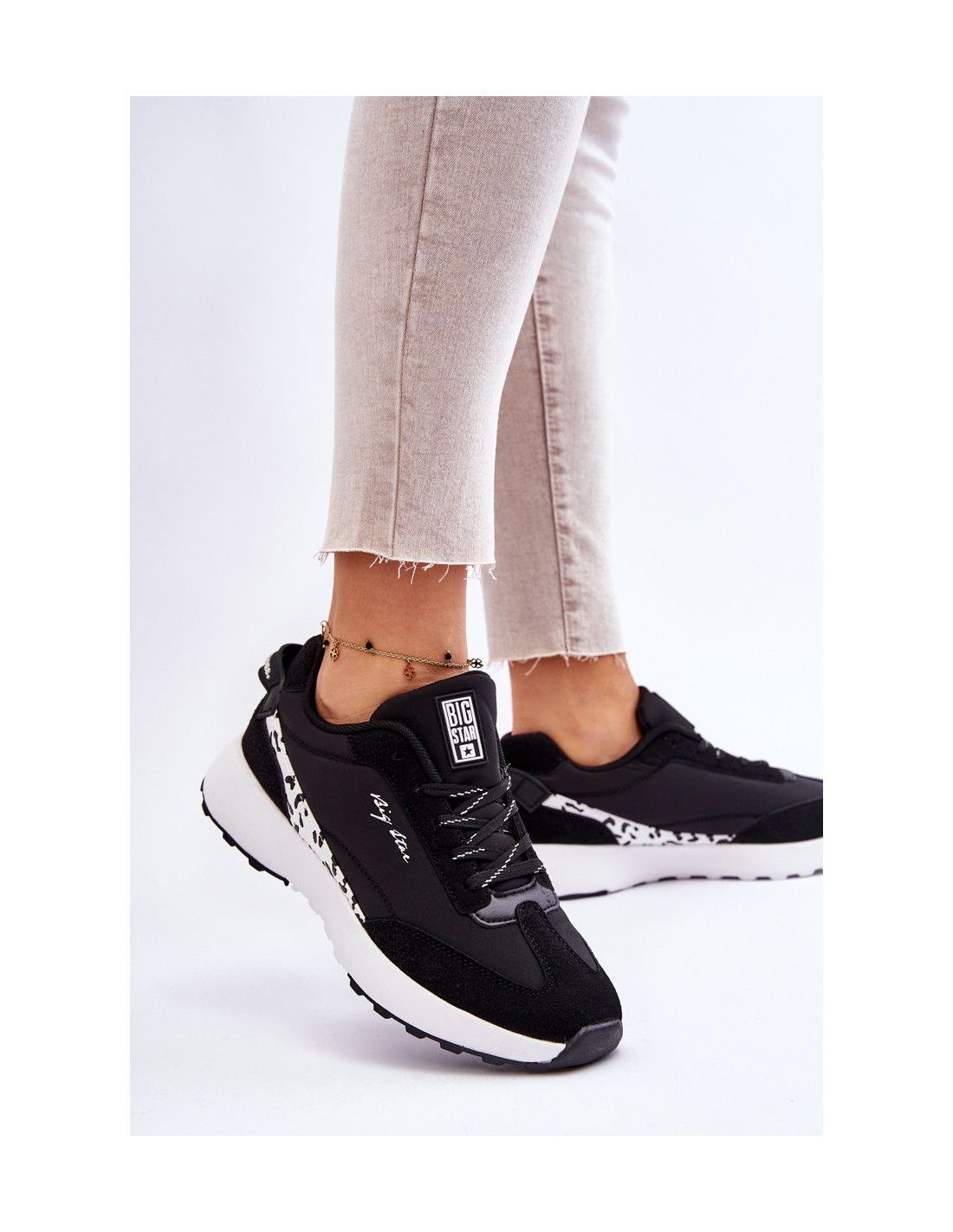 Madingi, moteriški Big Star sportbačiai yra pagaminti iš audinio ir ekologiškos odos. Modelis turi klasikinį suvarstymą. Memory Foam System vidpadis prisimena pėdos formą, puikiai priglunda, sugeria smūgius, yra atsparus deformacijai ir leidžia išgaruoti drėgmei bei reguliuoti temperatūrą. Šie batai buvo pastatyti ant platformos. Be to, jie turi standintą kulną. Rinkdamiesi dydį, žiūrėkite dydžių lentelę.