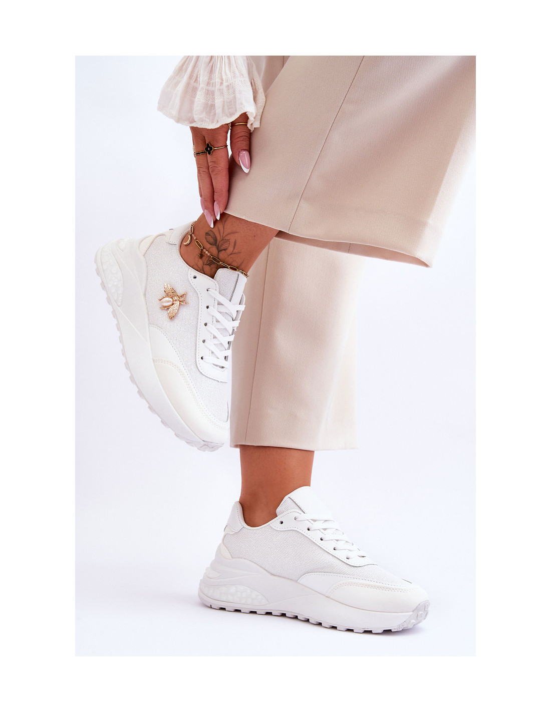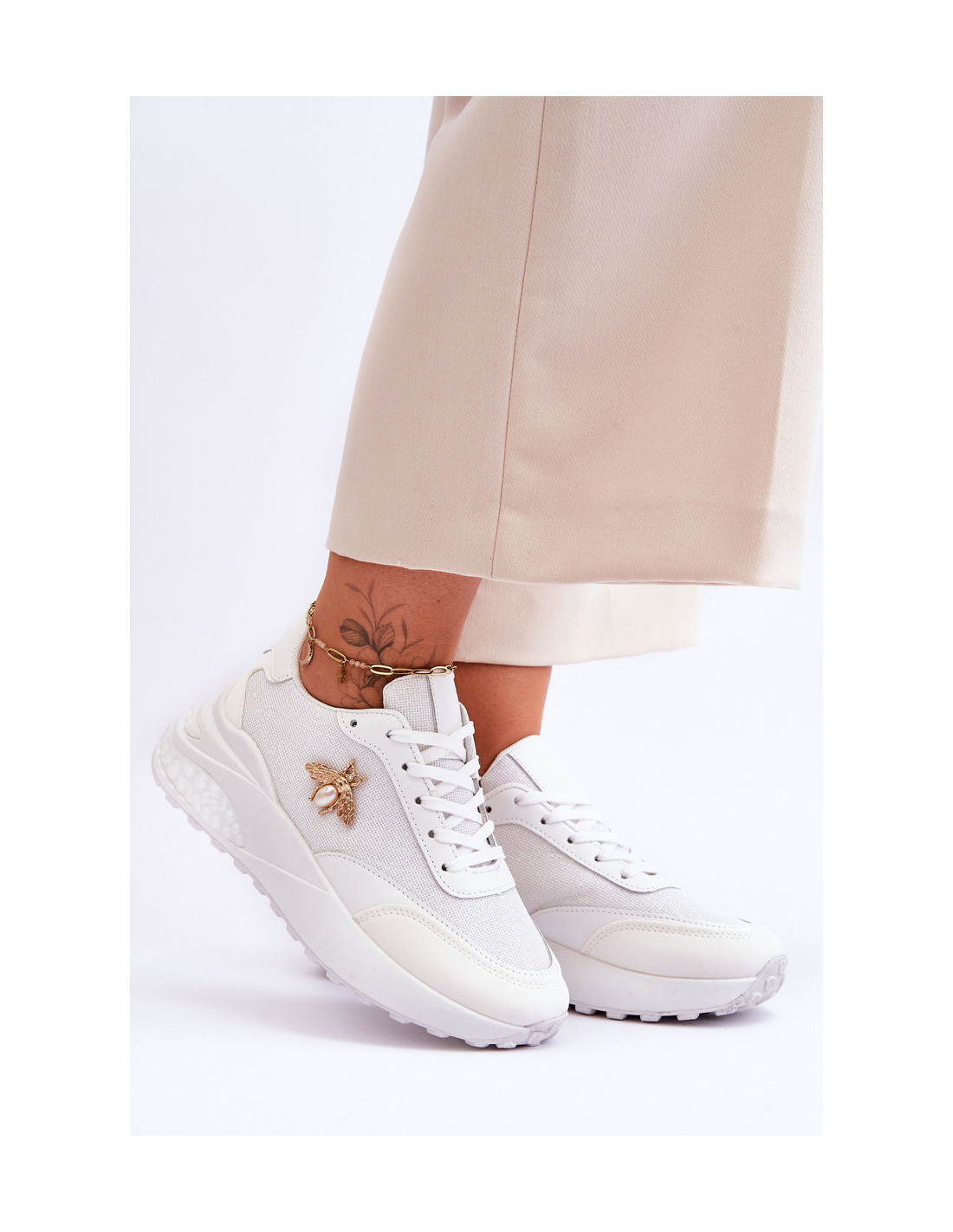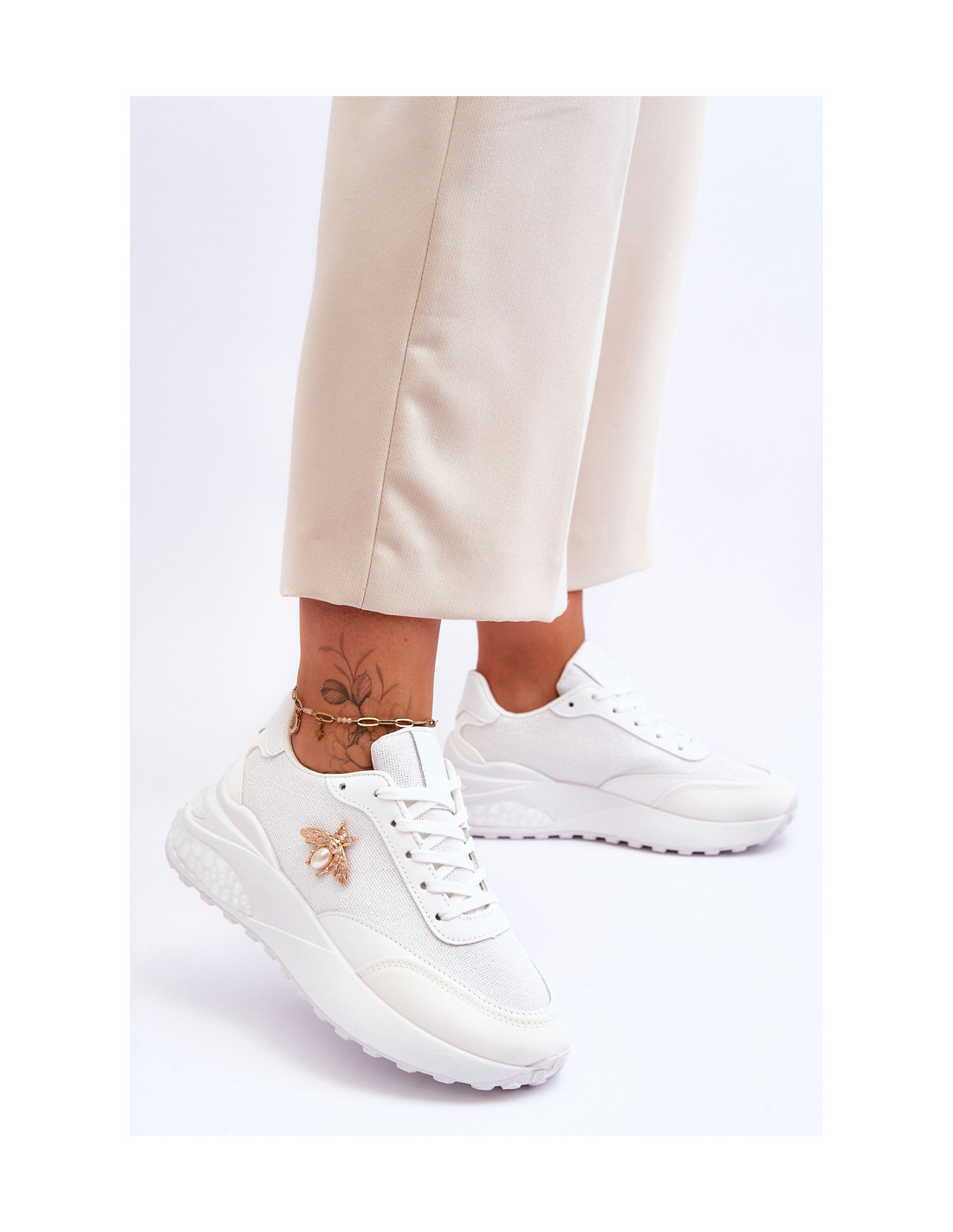 Nuostabūs, blizgūs sportiniai bateliai yra pagaminti iš ekologiškos odos ir audinio derinio. Nustatykite ant platformos ir žemo pleišto kulno. Šių batų viršutinės dalies šone yra vabzdžio puošyba. Klasikinis suvarstomas modelis leis tinkamai priderinti avalynę prie kojos pločio. Minkštas vidpadis užtikrina patogų naudojimą. Rinkdamiesi dydį žiūrėkite dydžių lentelę.