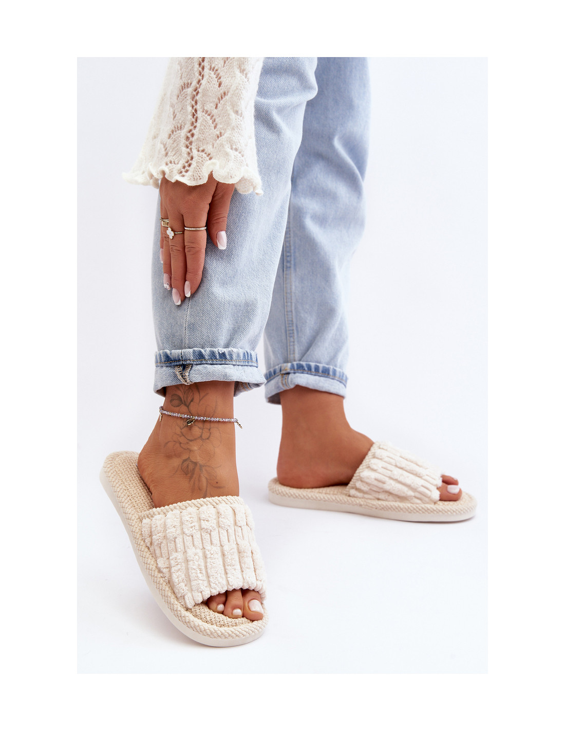 Patogios šlepetės su plačiu dirželiu, kuris palaiko pėdą. Ant plokščio pado jie užtikrina stabilumą ir patogumą naudojant. Pagaminta iš malonios liesti tekstilės medžiagos. Atviri kojų pirštai. Šis modelis tikrai taps jūsų mėgstamiausiu jūsų poilsio namuose priedu! Renkantis dydį, vadovaukitės dydžių lentele.