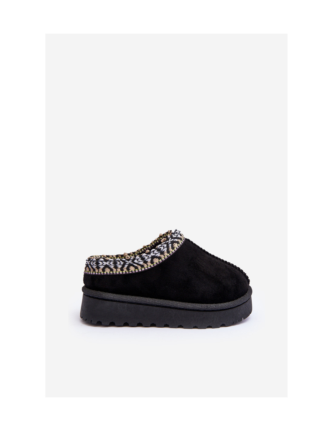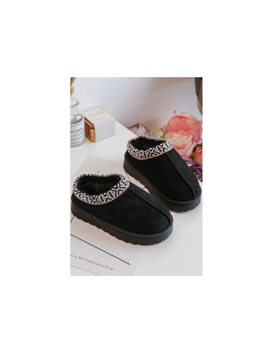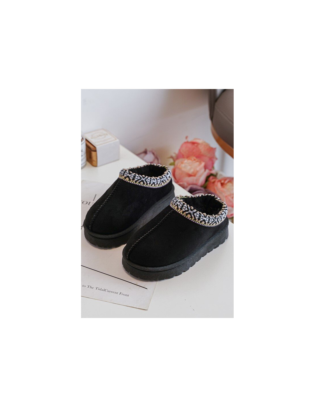 Vaikiškos šlepetės su madingu raštu viršutinėje dalyje. Slip-on modelis. Apšiltintas storu kailiu viduje. Padas iš gumos apsaugos nuo šaltos žemės. Pirštai uždengti. Taip pat peržiūrėkite kitus mūsų pasiūlyme esančius šlepečių modelius! Renkantis dydį, vadovaukitės dydžių lentele.