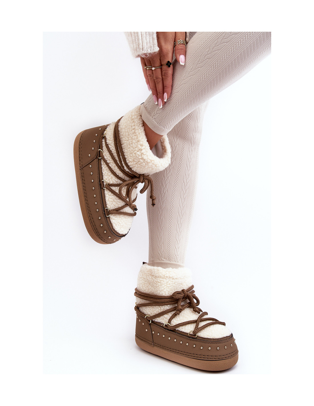 Unikalūs moteriški sniego batai yra pagaminti iš šalčiui ir vėjui atsparios medžiagos. Viršutinė dalis su dirbtiniu avikailiu ir smeigėmis puikiai tiks rudens ir žiemos sezonui. Klasikinis užsegamas modelis su papildomais raišteliais. Sniego batai buvo sumontuoti ant masyvios platformos. Jų viduje yra putplasčio ir batų antklodė, užtikrinanti aukštą apsaugą šaltomis dienomis. Renkantis dydį, vadovaukitės dydžių lentele.