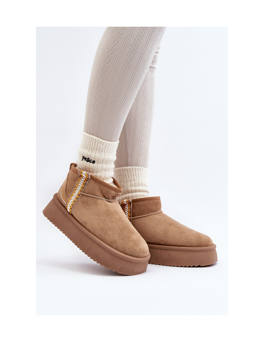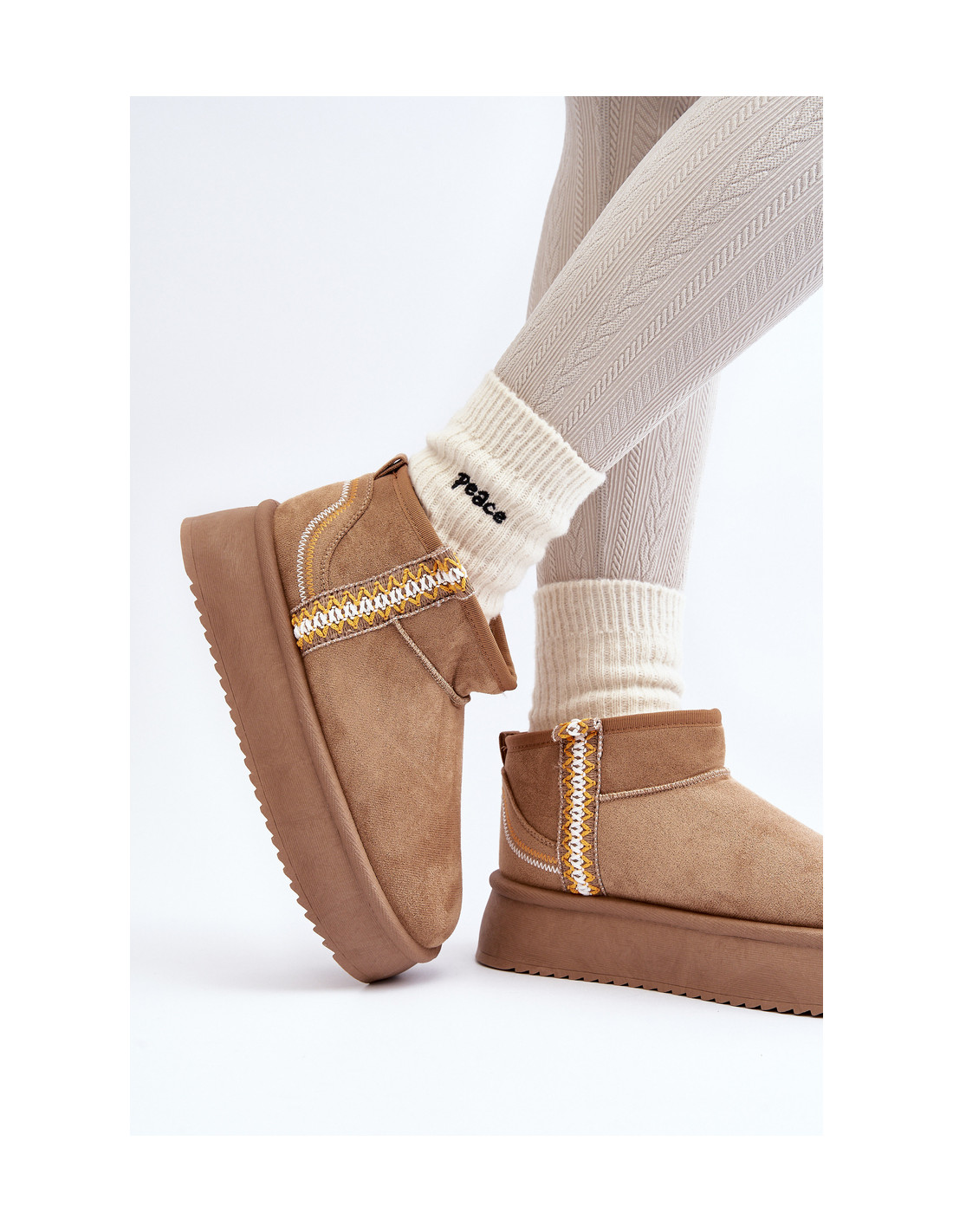 Platforminiai sniego batai – madingiausias stilius šį sezoną! Šis modelis pagamintas iš ekologiškos zomšos. Storas guminis padas puikiai izoliuoja nuo šaltos žemės. Batviršis iki kulkšnių dekoruotas actekų raštu. Vidus apšiltintas kailiu. Jūs privalote juos turėti! Renkantis dydį, vadovaukitės dydžių lentele.