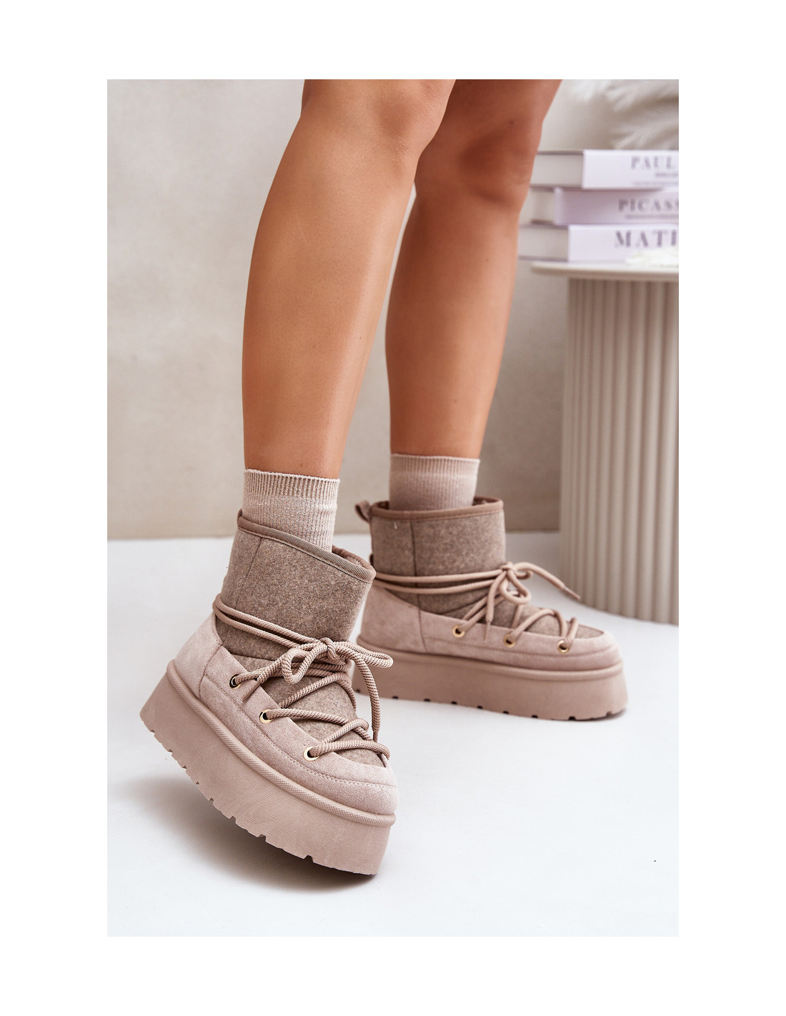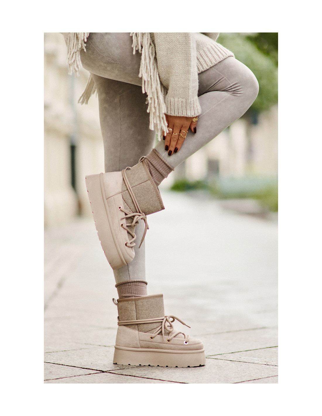 Stilingi platforminiai sniego batai yra puikus mados ir komforto derinys. Jie turi praktišką priekinį kaklaraištį, kuris užtikrina gerą prigludimą prie pėdos. Kailiu pamuštas interjeras garantuoja šilumą šaltomis dienomis. Patogus ir šiltas, puikiai tinka kasdieniam naudojimui ir žiemos pasivaikščiojimams. Renkantis dydį, vadovaukitės dydžių lentele.