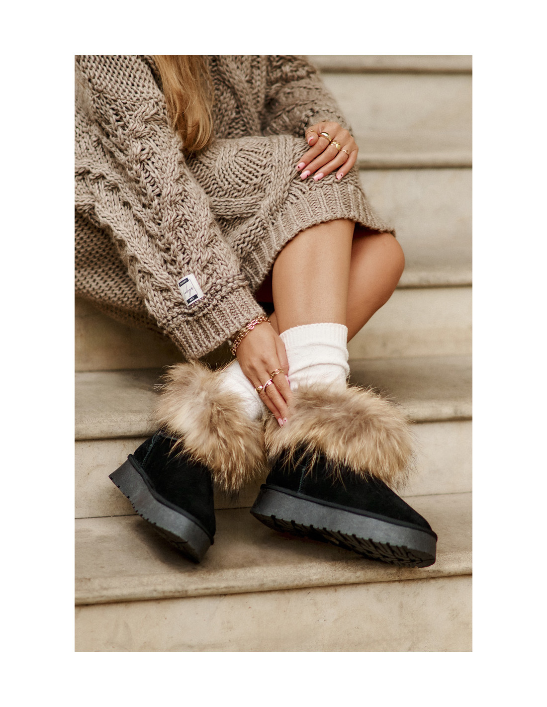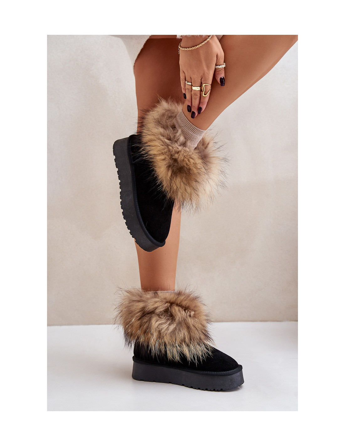 Moteriški sniego batai iš natūralios zomšos odos. Montuojamas ant platformos. Viršutinė viršutinė dalis dekoruota pūkuotu kailiuku, suteikiančiu jiems nepakartojamo charakterio. Šie madingi ir stilingi batai puikiai tiks žiemos dienoms, garantuojantys komfortą ir šilumą. Renkantis dydį, vadovaukitės dydžių lentele.