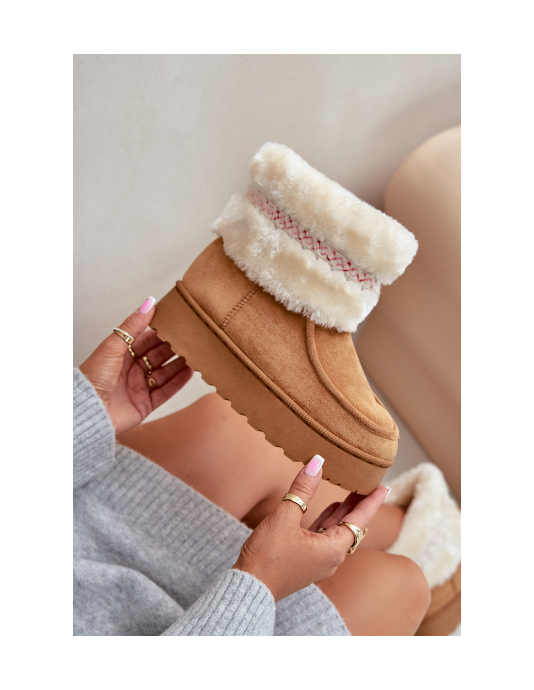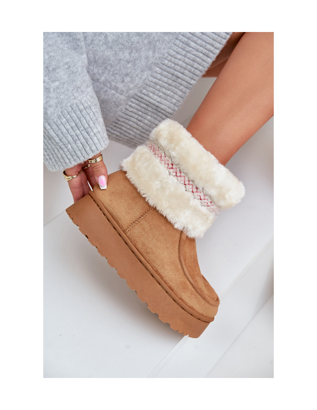 Platforminiai sniego batai iš ekologiškos zomšos yra stilingas ir funkcionalus pasirinkimas žiemai. Kailiuku ir madingu raštu dekoruota viršutinė dalis suteikia charakterio, o paaukštinta platforma izoliuoja juos nuo šaltos žemės, užtikrindama šilumą ir komfortą. Puikiai tinka šaltoms dienoms, juose patogumas derinamas su madingu dizainu. Šis modelis taip pat yra vaikiškų dydžių! Sukurkite rinkinį mama + vaikas! Renkantis dydį, vadovaukitės dydžių lentele.